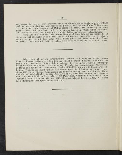 Außer geschichtlicher und zeitschriftlicher Literatur sind besonders benutzt worden Friedrich Paulsens pädagogische Schriften und Rudolf Lehmann, Frziehung und Unterricht, Berlin 1912. Wertvolle Dienste haben geleistet die von Eugen Grünwald herausgege- benen Veröffentlichungen der„Vereinigung der Freunde des humanistischen Gymnasiums in Berlin und der Provinz Brandenburg“, Berlin 1909— 1912, sowie die in diesem Kreise ge- haltenen Vorträge von Adolf Harnack, Die Notwendigkeit der Erhaltung des alten Gymna- siums, 1900, Gustav Roethe, Humanistische und nationale Bildung, 1906, Eduard Meyer, Huma- nistische und geschichtliche Bildung, 1907, Alois Riehl, Humanistische Ziele des mathemat. und naturwissenschaftlichen Unterrichtes, 1900, Paul Cauer, Wissenschaft und Schule in ihrem Verhältnis zum klassischen Altertum, 1910, Otto Immisch, Das Erbe der Alten, 1911, Theod. Kipp, Humanismus und Rechtswissenschaft, 1912.