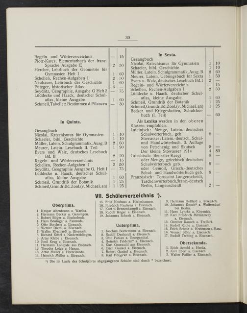 73 1 1 VII. Schülerverzeichnis)). 15. Fritz Neuhaus a. Herleshausen. 9. Hermann Hoßfeld a. Eisenach. Oberprima. 16. Friedrich Paulssen a. Eisenach. 10. Johannes Knoch“ a. Woltersdorf 17. Kurt v. Rennenkampff a. Eisenach. bei Berlin. 4 hesbeanreillsgeimi Tan aüteean 18. Rudolf Rüger a. Eisenach. 11. Hans Lyncke a. Köpenick. 3. Robert Böger a. hs pieeeu 3 19. Johannes Schenk a. Eisenach. 112. Kan 1auſcht Mittenzwey 4 Re mnirer iartote 13. Güniner ſlanneh a. Treffurt. . SOtto otllers A, lelsehgeler Unterprima. 14. Rudolf Rothe a. Eisenach. 6. Werner Dietel a. Eisenach. 4 15. Erich Schniz a. Kreiensen a. Harz 7. Walter Eberhardt a. Eisenach. 1. Joachim Bornemann a. Eisenach. 16. Werner Stöhr a. Pisenach.. 8. Richard Kittel a. Niederröblingen. 2. Rudolf Denhardt a. Eisenach. 17. Rudolf Trebing a. Eisenach 9. Artur Klebe a. Eisenach. 3. Otto Fabian a. Georeehthan. E a. 3 10. Emil Krug a. Eisenach. 4. Heinrich Friderici“* a. Eisenach. 11. Hermann Loheyde aus Eisenach. 5. Kurt Gronwald aus Eisenach. Obersekunda. 12. Theodor Lotze a Hanau. 6. Erich Gunkel a. Eisenach. 1. Erich Arnold a. Herda. 13. Artur Müller a. Hötzelsroda 7. Robert Gunkel a. Eisenach. 2. Karl Ebert a. Eisenach. 14. Heinrich Müller a. Eisenach. 8. Karl Hörnicke a. Eisenach. 3. Walter Fallier a. Eisenach.
