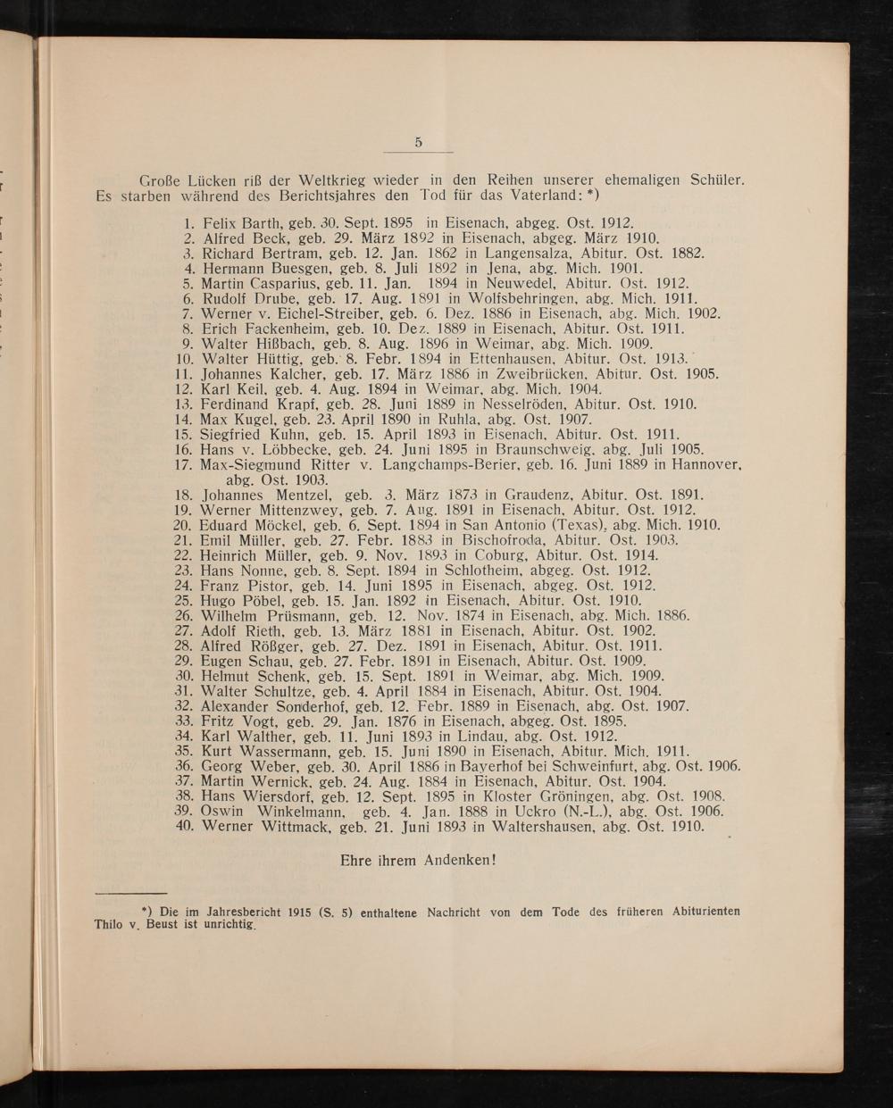 . Felix Barth, geb. 30. Sept. 1895 in Eisenach, abgeg. Ost. 1912. . Alfred Beck, geb. 29. März 1802 in Eisenach, abgeg. März 1910. . Richard Bertram, geb. 12. Jan. 1862 in Langensalza, Abitur. Ost. 1882. . Hermann Buesgen, geb. 8. Juli 1892 in Jena, abg. Mich. 1901. . Martin Casparius, geb. 11. Jan. 1804 in Neuwedel, Abitur. Ost. 1912. . Rudolf Drube, geb. 17. Aug. 1891 in Wolfsbehringen, abg. Mich. 1911. Werner v. Eichel-Streiber, geb. 6. Dez. 1886 in Eisenach, abg. Mich. 1902. Frich Fackenheim, geb. 10. Dez. 1889 in Eisenach, Abitur. Ost. 1911. Walter Hißbach, geb. 8. Aug. 1896 in Weimar, abg. Mich. 1900. 10. Walter Hüttig, geb. 8. Febr. 1 804 in Ettenhausen, Abitur. Ost. 1913. 11. Johannes Kalcher, geb. 17. März 1886 in Zweibrücken. Abitur. Ost. 1905. 12. Karl Keil, geb. 4. Aug. 1894 in Weimar, abg. Mich. 1904. 13. Ferdinand Krapf, geb. 28. Juni 1880 in Nesselröden, Abitur. Ost. 1910. 14. Max Kugel, geb. 23. April 1890 in Ruhla, abg. Ost. 1907. 15. Siegfried Kuhn, geb. 15. April 1893 in Eisenach, Abitur. Ost. 1911. . Hans v. Löbbecke, geb. 24. Juni 1895 in Braunschweig. abg. Juli 1905. 17. Max-Siegmund Ritter v. Langchamps-Berier, geb. 16. Juni 1880 in Hannover. abg. Ost. 1903. 18. Johannes Mentzel, geb. 3. März 1873 in Graudenz, Abitur. Ost. 1891. 19. Werner Mittenzwey, geb. 7. Aug. 1801 in Eisenach. Abitur. Ost. 1912. . Eduard Möckel, geb. 6. Sept. 1804 in San Antonio(Texas), abg. Mich. 1910. 21. Emil Müller, geb. 27. Febr. 1883 in Bischofroda, Abitur. Ost. 1903.