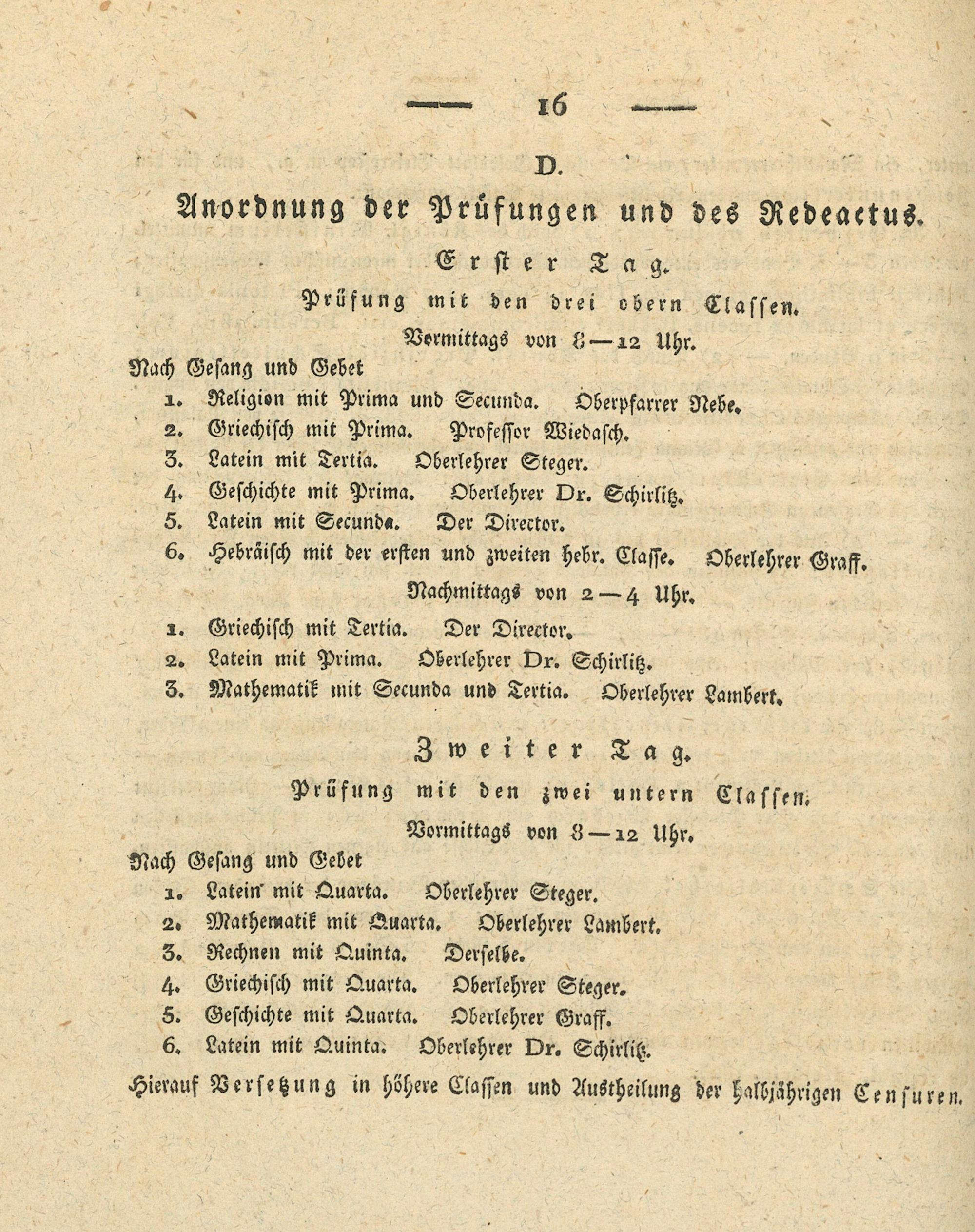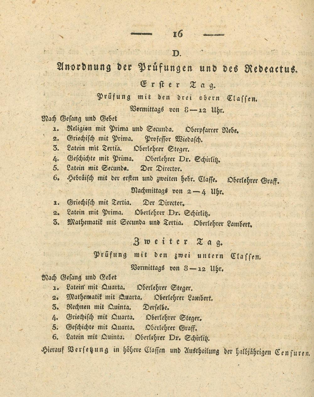 Erſter Tag. Prüfung mit den drei obern Claſſen. Vormittags von 6—12 Uhr. Nach Geſang und Gebet 1. Religion mit Prima und Secunda. Oberpfarrer Nebe. 2. Griechiſch mit Prima. Profeſſor Wiedaſch. 3. Latein mit Tertia. Oberlehrer Steger. 4. Geſchichte mit Prima. Oberlehrer Dr. Schirlitz. 5. Latein mit Secunda. Der Director. 6. Hebräiſch mit der erſten und zweiten hebr. Claſſe. Oberlehrer Graff. Nachmittags von 2— 4 Uhr. 1. Griechiſch mit Tertia. Der Director. 2. Latein mit Prima. Oberlehrer Dr. Schirlitz. 5. Mathematik mit Secunda und Tertia. Oberlehrer Lambert.
