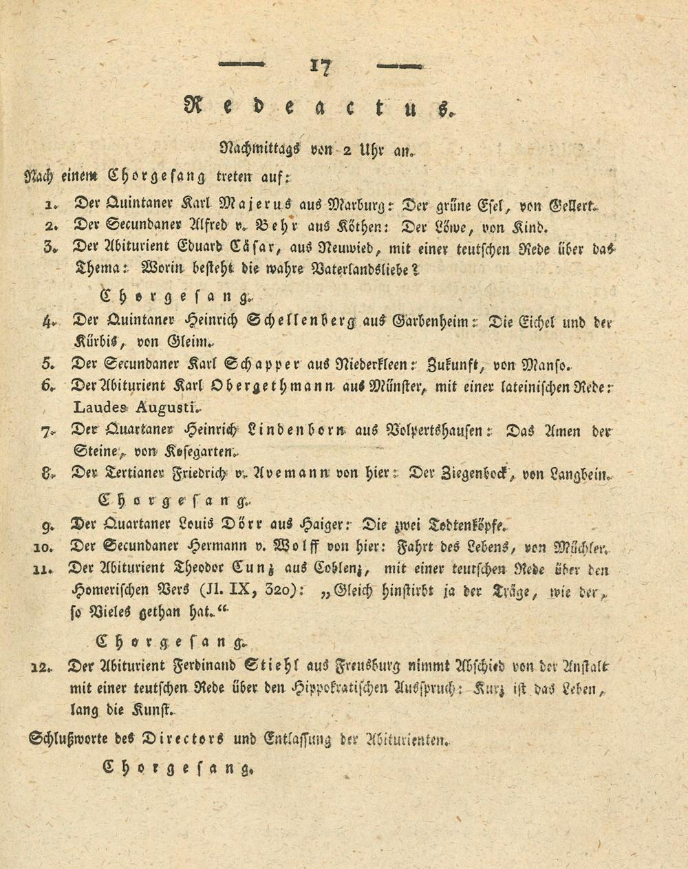 Chorgeſang⸗ Der Quintaner Heinrich Schellenberg aus Garbenheim: Die Eichel und der Kürbis, von Gleim. Der Secundaner Karl Schapper aus Niederkleen: Zukunft, von Manſo⸗ Der Abiturient Karl Obergethmann aus Münſter, mit einer lateiniſchen Rede: Laudes Augusti. Der Quartaner Heinrich Lindenborn aus Bolpertshauſen:: Das Amen der Steine, von Koſegarten. Der Tertianer Friedrich v. Avemann von hier: Der Ziegenbock, von Langbein.