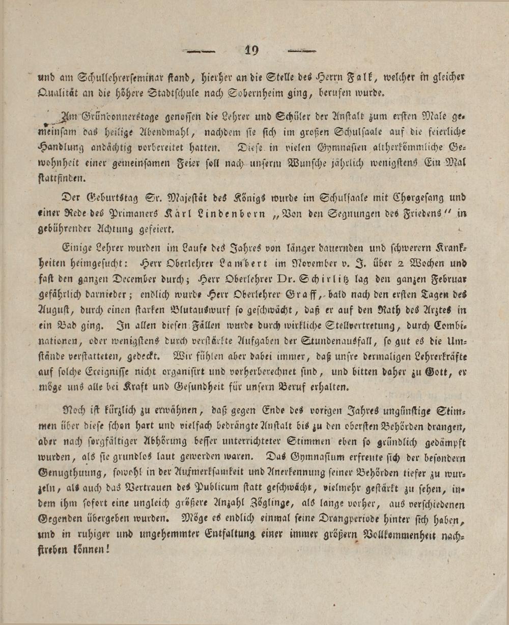 Einige Lehrer wurden im Laufe des Jahres von länger danernden und ſchwerern Krank⸗ heiten heimgeſucht: Herr Oberlehrer Lambert im November v. J. über 2 Wochen und faſt den ganzen December durch; Herr Oberlehrer Dr. Schirlitz lag den ganzen Februar gefährlich darnieder; endlich wurde Herr Oberlehrer Graff, bald nach den erſten Tagen des Auguſt, durch einen ſtarken Blutauswurf ſo geſchwächt, daß er auf den Rath des Arztes in ein Bad ging. In allen dieſen Fällen wurde durch wirkliche Stellvertretung, durch Combi⸗ nationen, oder wenigſtens durch verſtärkte Aufgaben der Stundenausfall, ſo gut es die Um⸗ ſtände verſtatteten, gedeckt. Wir fühlen aber dabei immer, daß unſre dermaligen Lehrerkräfte auf ſolche Ereigniſſe nicht organiſirt und vorherberechnet ſind, und bitten daher zu Gott, er möge uns alle bei Kraft und Geſundheit für unſern Beruf erhalten.