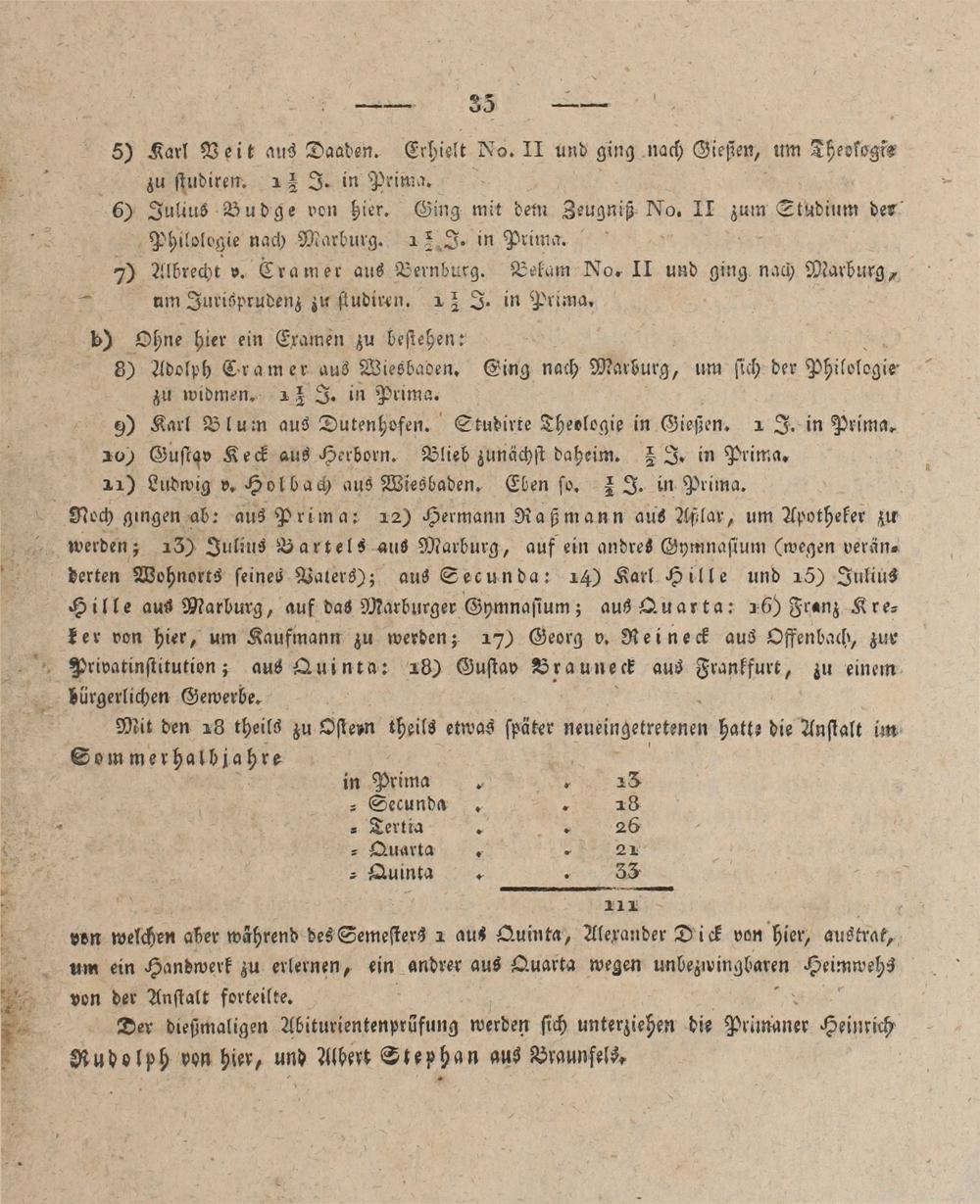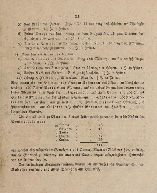 5) Karl Veit aus Daaden. Erhielt No. II und ging nach Gießen, um Theoſogie zu ſtudiren. 1 ¼½ J. in Prima. 5 6) Julius Budge von hier. Ging mit dem Zeugniß No. II zan Studium der Philologie nach Marburg. 11 J. in Prima. 7) Albrecht v. Cramer aus Bernburg. Bekam No. II und ging nach Marburg, um Jurisprudenz zu ſtudiren. 1 ½ J. in Prima. b) Ohne hier ein Examen zu beſtehen: 8) Adolph Lram en 8 Wiesbaden. Eing nach Marburg, um ſich der Philologie zu widmen. 1 ½ J. in Prima. 9) Karl Blum ns Dutenhofen. Studirte Theologie in Gießen. 1 J. in Prima. 20) Guſtav Keck aus Herborn. Blieb zunächſt daheim. ½ J. in Prima. 11) Ludwig v. Holbach aus Wiesbaden. Eben ſo. 2½ J. in Prima.