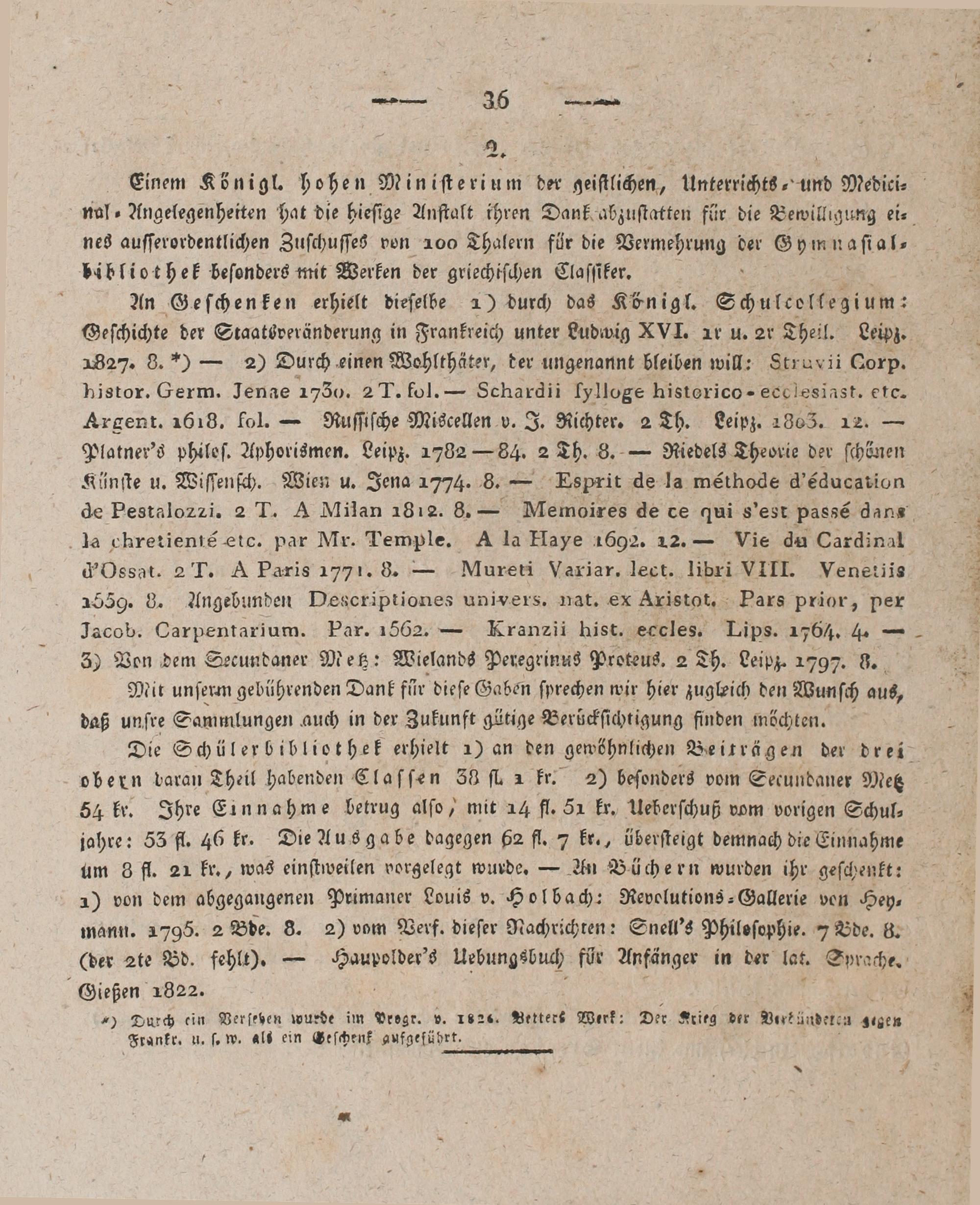 nes auſſerordentlichen Zuſchuſſes von 100 Thalern für die Vermehrung der Gymnaſial⸗ bibliothek beſonders mit Werken der griechiſchen Claſſiker. An Geſchenken erhielt dieſelbe 1) durch das Königl. Schulcollegium: Geſchichte der Staatsveränderung in Frankreich unter Ludwig XVI. ar u. 2r Theil. Leipz. 2827. 8.*)— 2) Durch einen Wohlthäter, der ungenannt bleiben will: Struvii Corp. histor. Germ. Jenae 1730. 2 T. fol.— Schardii fylloge historico-ecclesiast. etc. Argent. 1618. fol.— Ruſſiſche Miscellen v. J. Richter. 2 Th. Leipz. 1363. 12.— Platner's phileſ. Aphorismen. Leipz. 1782— 84. 2 Th. 8.— Riedels Theorie der ſchönen Künſte u. Wiſſenſch. Wien u. Jena 1774. 8.— Esprit de la méthode d'éducation