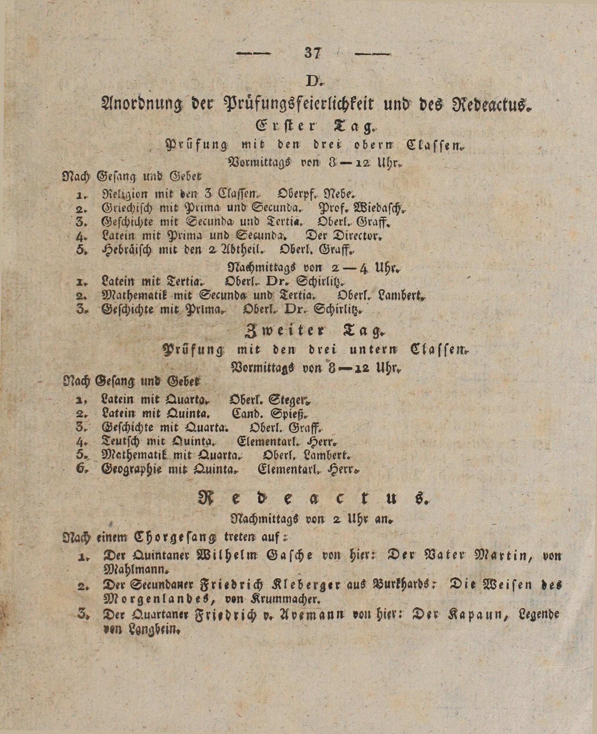 tdnung der Pruͤfungsfeierlichkeit und des Redeactus. Erſter Tag. Prüfung mit den drei obern Claſſen. 5 Vormittags von 3— 12 Uhr. Nach Geſang und Gebet 4 1. Religion mit den 3 Claſſen. Oberpf. Nebe. 2. Griechiſch mit Prima und Secunda. Prof. Wiedaſch. 3. Geſchichte mit Secunda und Tertia. Oberl. Graff. A. Latein mit Prima und Secunda. Der Director. 5. Hebräiſch mit den 2 Abtheil. Oberl. Graff. Nachmittags von 2— 4 Uhr. x. Latein mit Tertia. Oberl. Dr. Schirlitz. 2. Mathematik mit Secunda und Tertia. Oberl. Lambert. 3. Deſchicht⸗ mit Pumm. Oberl. Dr. Schirlitz.