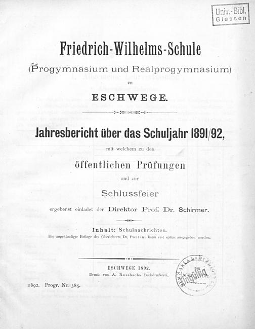 Jahresbericht : über das Schuljahr ... / Friedrich-Wilhelms-Schule (Progymnasium und Realprogymnasium bzw. Realschule) zu Eschwege