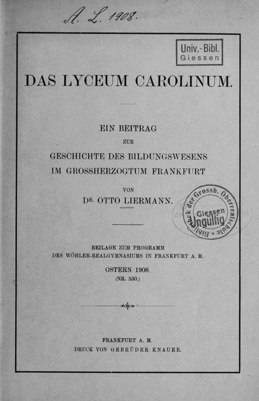 Das Lyceum Carolinum : ein Beitrag zur Geschichte des Bildungswesens im Großherzogtum Frankfurt / Otto Liermann