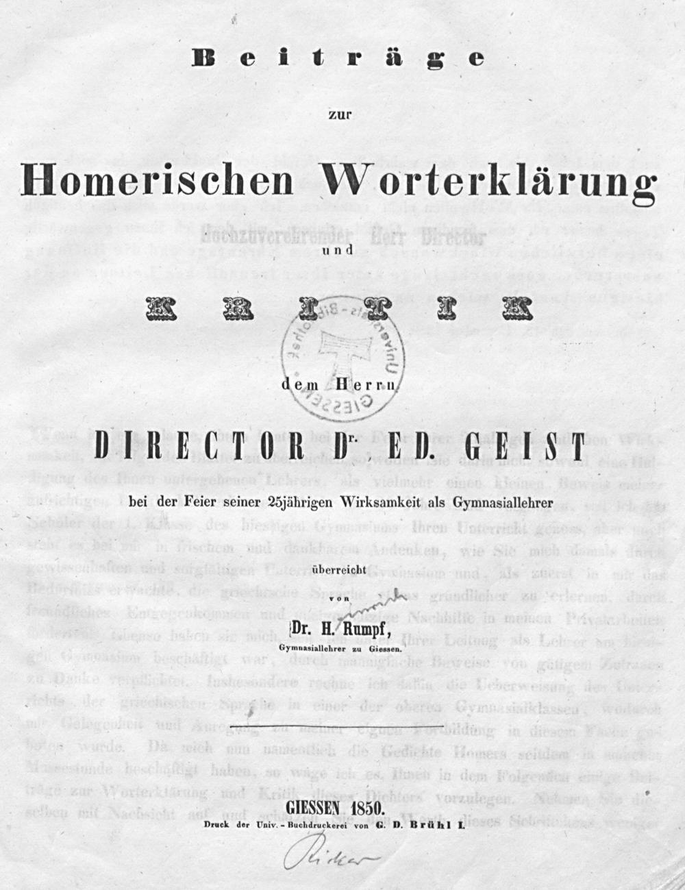 Beiträge zur Homerischen Worterklärung und Kritik : dem Herrn Director Dr. Ed. Geist ; bei der Feier seiner 25jährigen Wirksamkeit als Gymnasiallehrer überreicht / von H. Rumpf