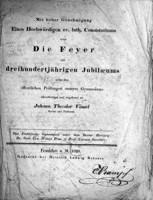 Das Frankfurter Gymnasium unter dem Rector Hirtzwig. Dr. Guil. Ern. Weberi Pror. et Prof. Carmen Saeculare : Mit hoher Genehmigung Eines Hochwürdigen ev. luth. Consistoriums zeigt Die Feyer des dreihundertjährigen Jubilaeums nebst den öffentlichen Prüfungen unseres Gymnasiums ... an / Johann Theodor Vömel Rector und Professor