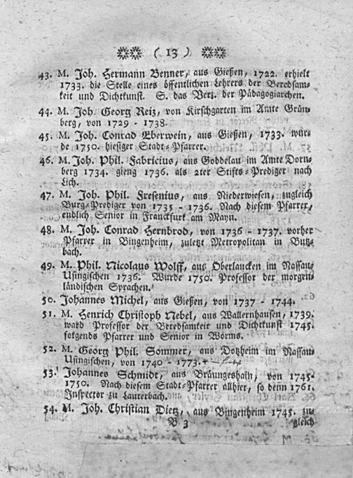 Historische Anzeige von der ersten Stiftung und Verlegung des Giesser academischen Pädagogiums auch denen von Anfang bis daher daran gestandenen Lehrern : womit zugl. alle Gönner u. Freunde d. Wissenschaften zu der ... öffentlichen Prüfung der Jugend ... eingeladen werden / von Johann Jacob Ludwig Borck