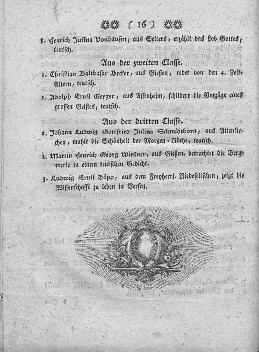 Historische Anzeige von der ersten Stiftung und Verlegung des Giesser academischen Pädagogiums auch denen von Anfang bis daher daran gestandenen Lehrern : womit zugl. alle Gönner u. Freunde d. Wissenschaften zu der ... öffentlichen Prüfung der Jugend ... eingeladen werden / von Johann Jacob Ludwig Borck