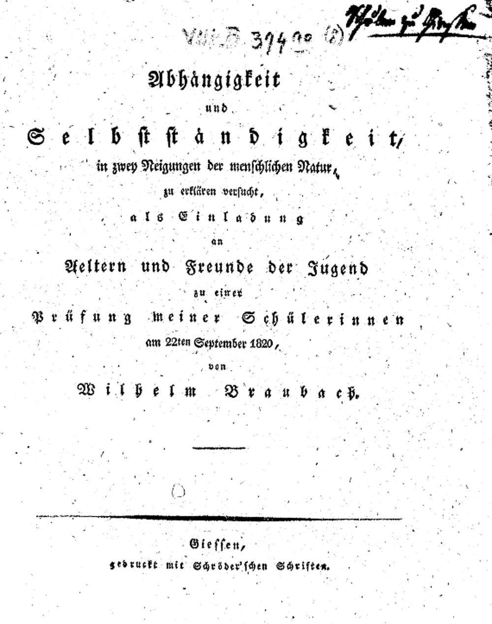 Abhängigkeit und Selbständigkeit in zwey Neigungen der menschlichen Natur : zu erklären versucht, als Einladung an Aeltern und Freunde der Jugend zu einer Prüfung meiner Schülerinnen am 22ten September 1820 / von Braubach, Wilhelm