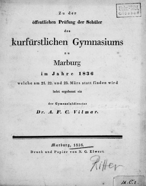 Zu der öffentlichen Prüfung der Schüler des Kurfürstlichen Gymnasiums zu Marburg im Jahre ... ladet ergebenst ein der Gymnasialdirector