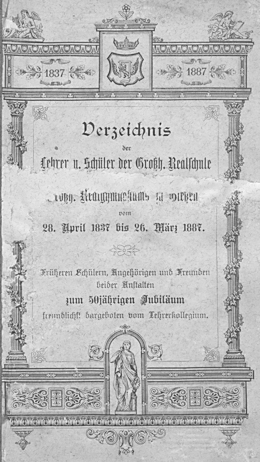 Verzeichnis der Lehrer und Schüler der Großh. Realschule und des Großh. Realgymnasiums zu Gießen vom 28. April 1837 an bis zum 26. März 1887 : früheren Schülern, Angehörigen und Freunden beider Anstalten zum 50jährigen Jubiläum freundlichst dargeboten von dem Lehrerkollegium / [Vorwort:] O. Buchner ...