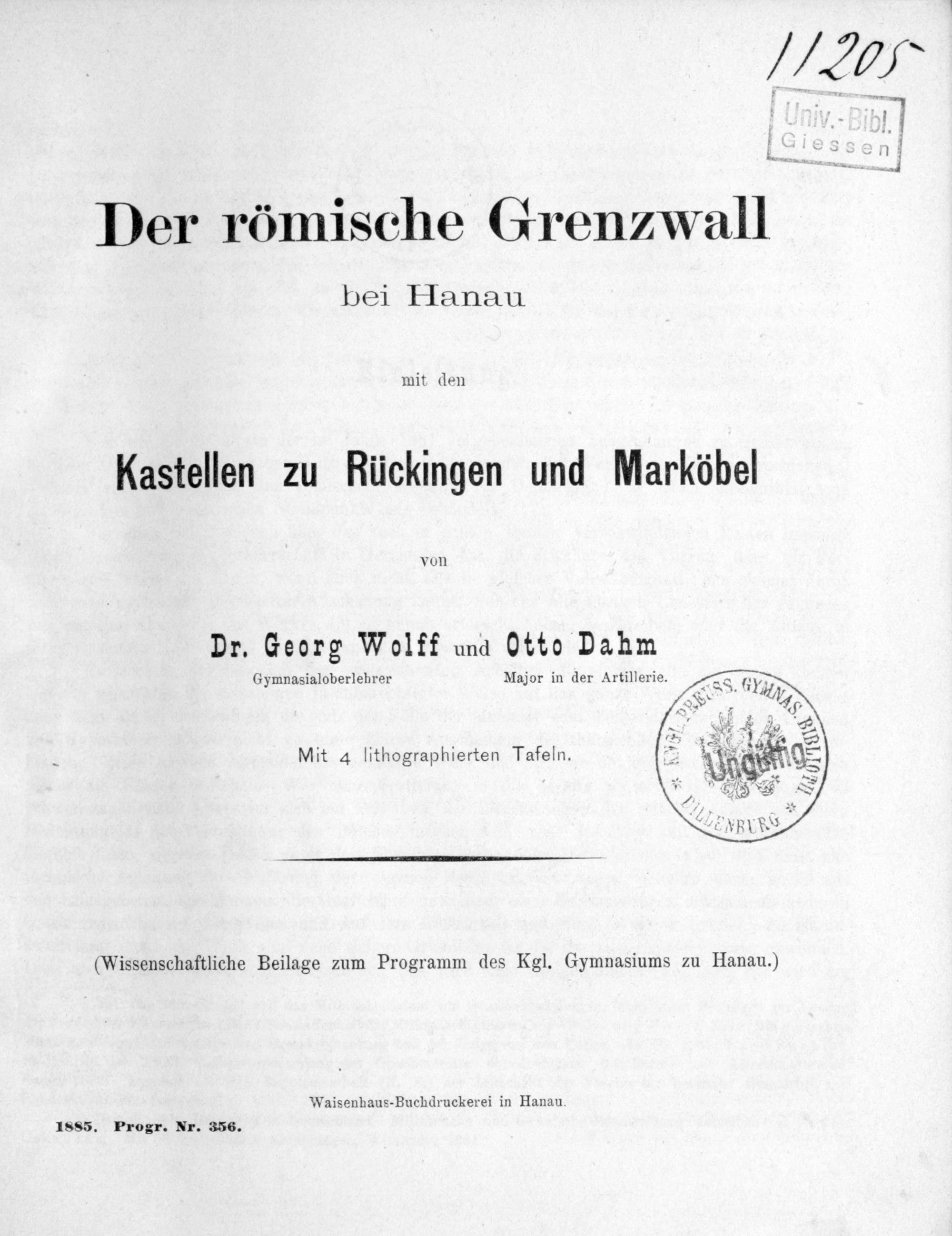 Der römische Grenzwall bei Hanau mit den Kastellen zu Rückingen und Marköbel / von Georg Wolff und Otto Dahm