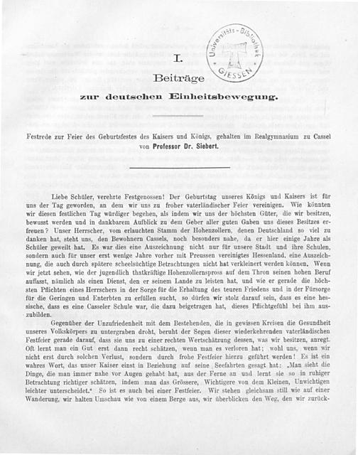 I. Beiträge zur deutschen Einheitsbewegung : Kaisersgeburtstagsrede / von Hermann Siebert
