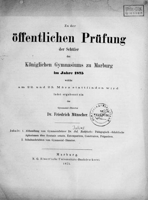 Zu der öffentlichen Prüfung der Schüler des Königlichen Gymnasiums zu Marburg ... ladet ... ein