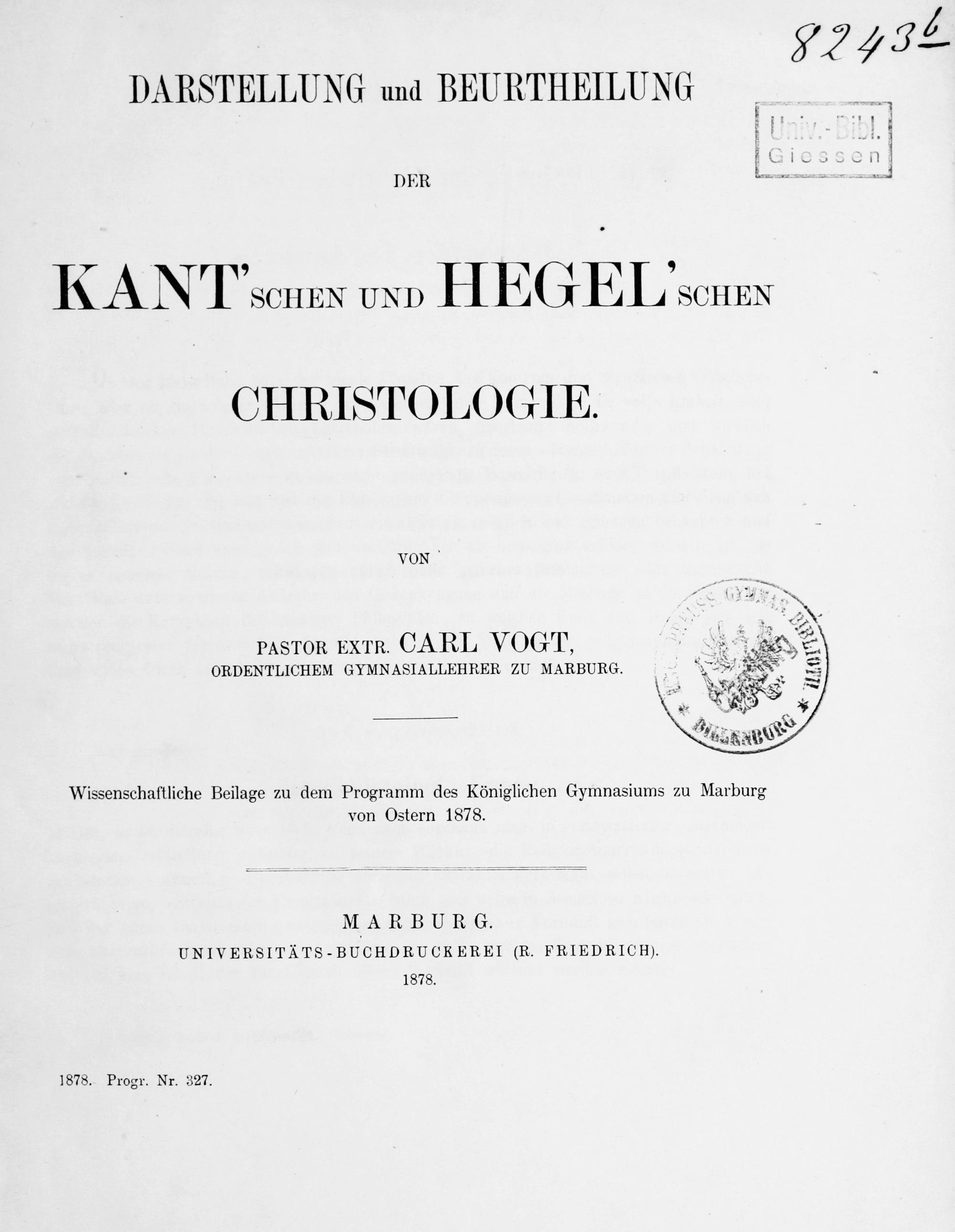 Darstellung und Beurtheilung der Kant'schen und Hegel'schen Christologie / Carl Vogt