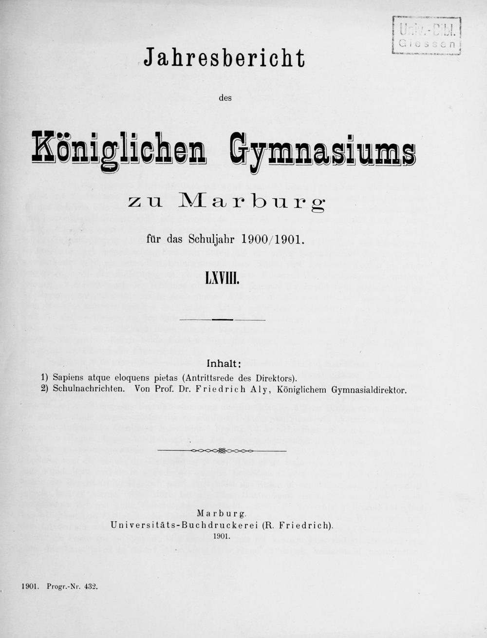 Sapiens atque eloquens pietas : (Antrittsrede des Direktors) / [Friedrich Aly]