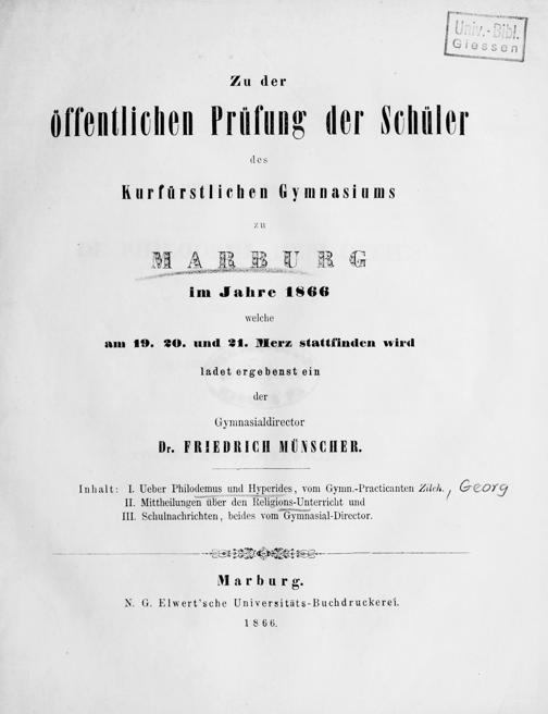 Zu der öffentlichen Prüfung der Schüler des Königlichen Gymnasiums zu Marburg ... ladet ... ein