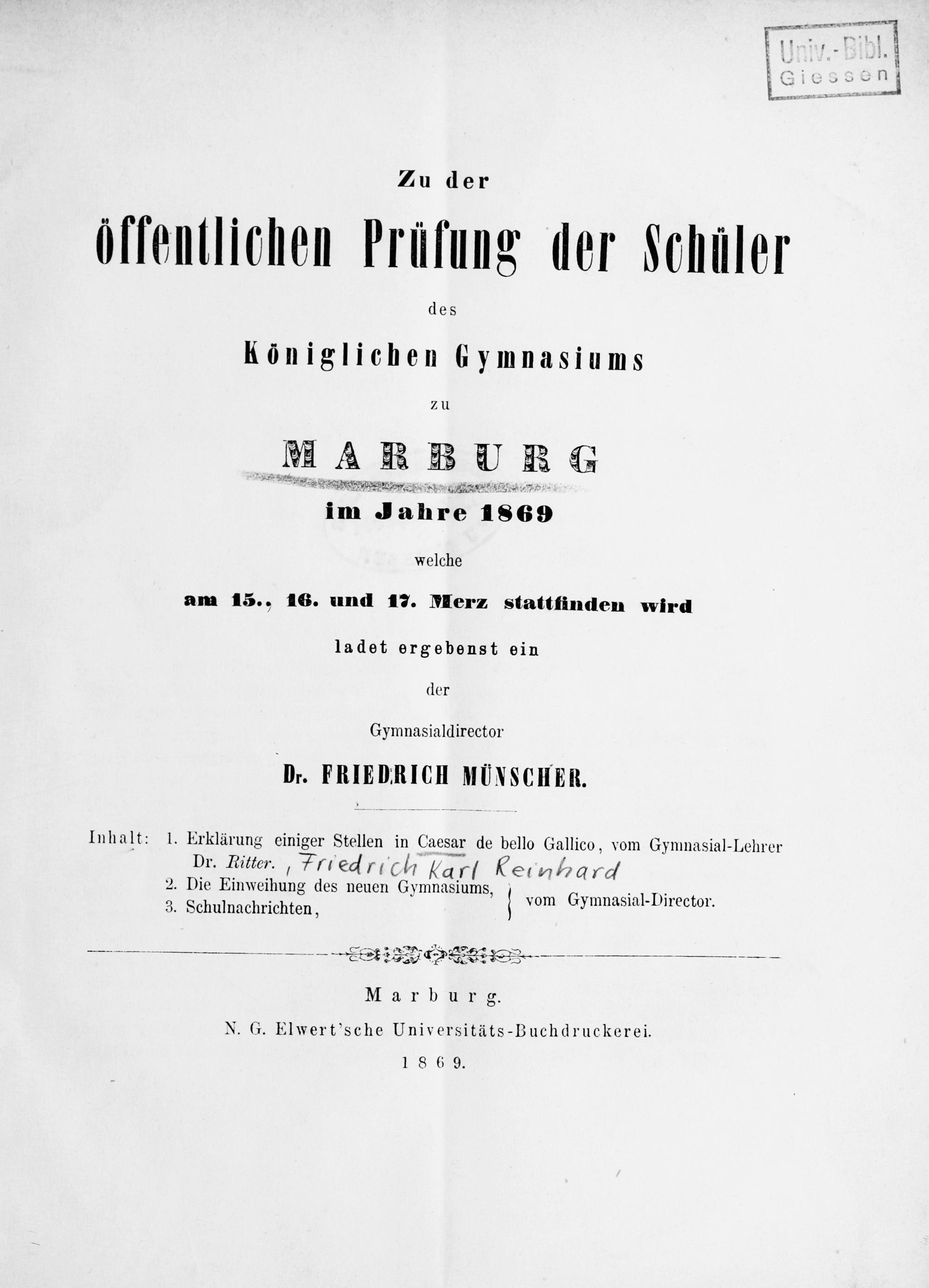 Zu der öffentlichen Prüfung der Schüler des Königlichen Gymnasiums zu Marburg ... ladet ... ein