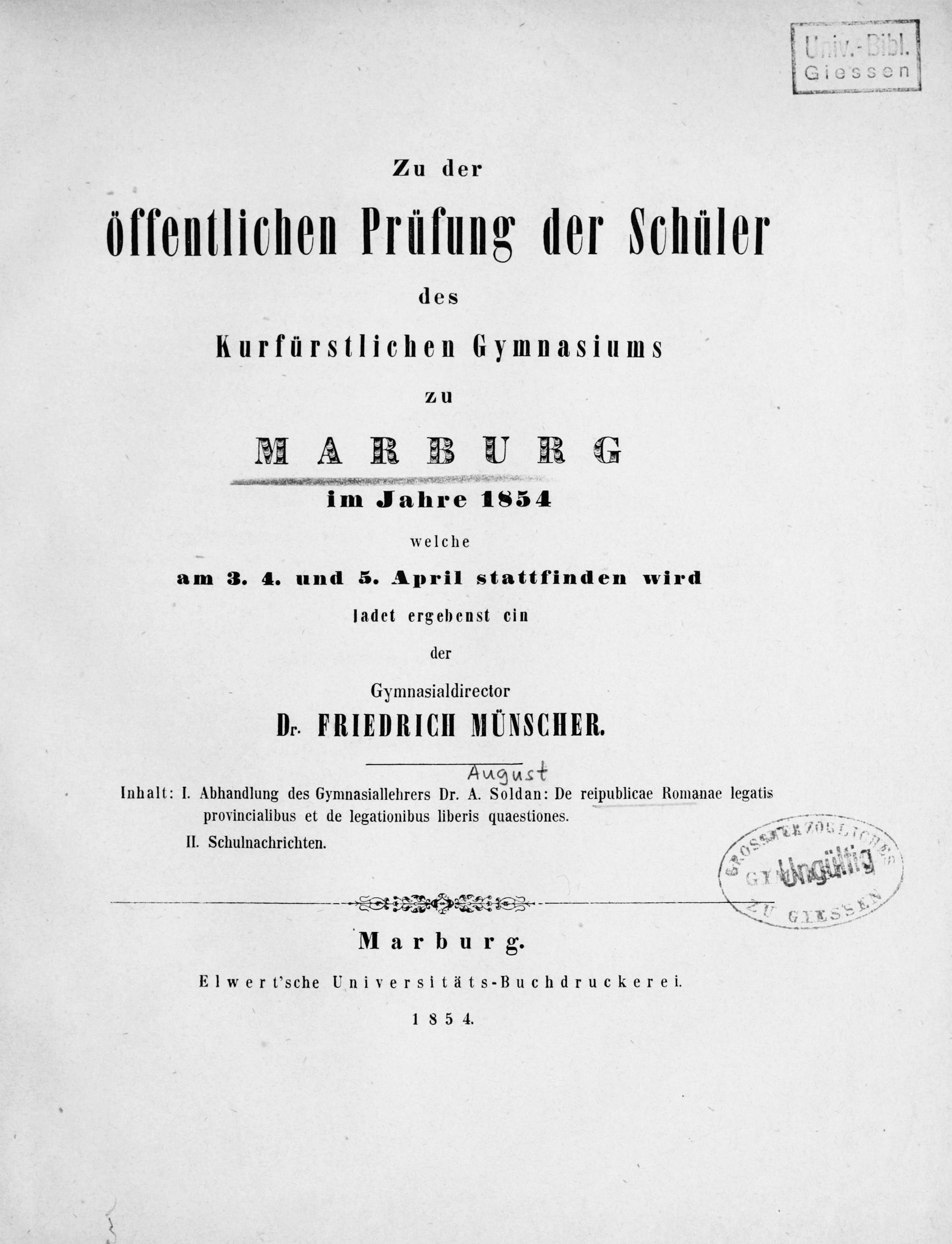 Zu der öffentlichen Prüfung der Schüler des Kurfürstlichen Gymnasiums zu Marburg im Jahre ... ladet ergebenst ein der Gymnasialdirector