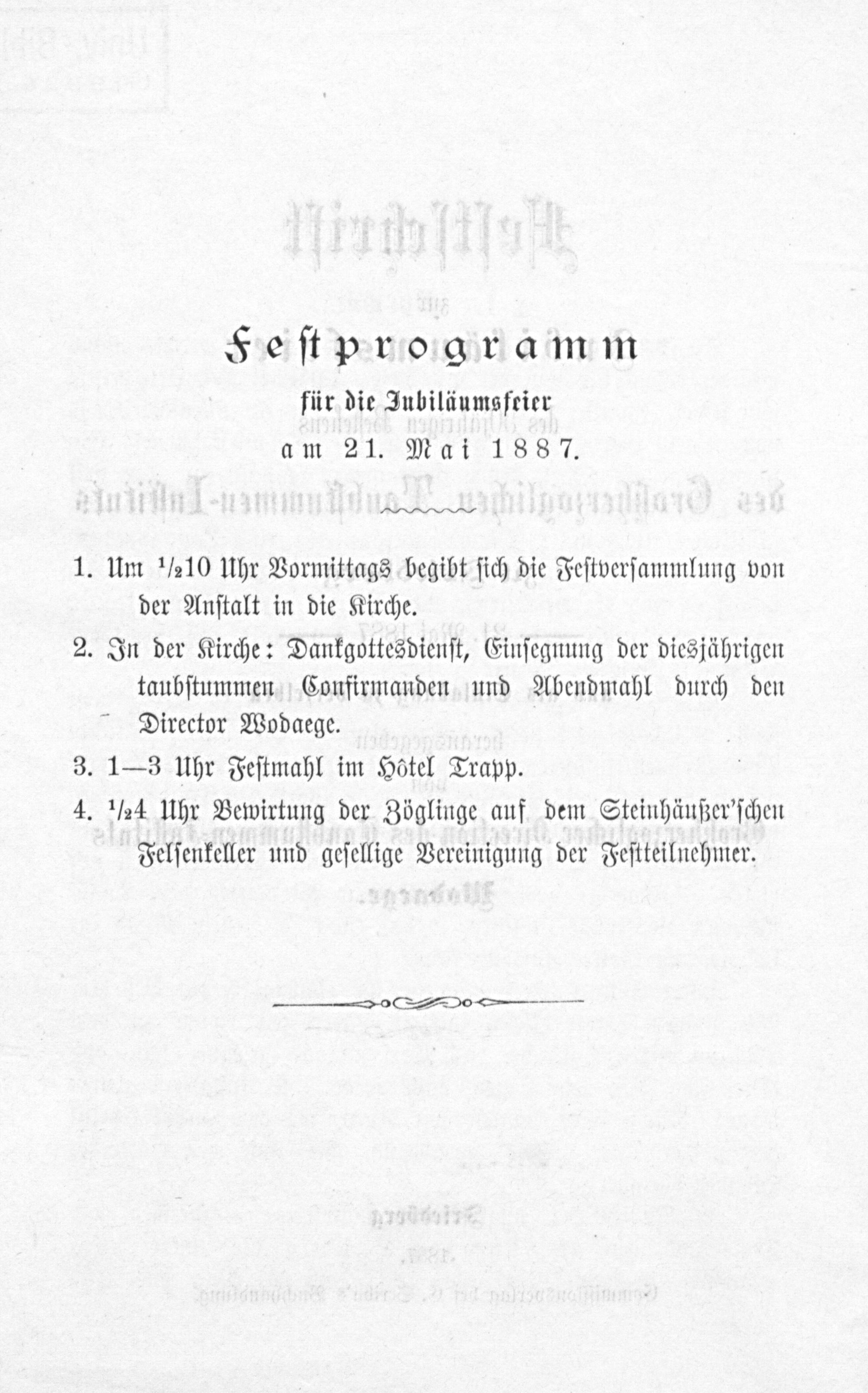 Festschrift zur Jubiläumsfeier des 50jährigen Bestehens des Großherzoglichen Taubstummen-Instituts zu Friedberg : 21. Mai 1887 ; und als Einladung zu derselben / hrsg. von Wodaege