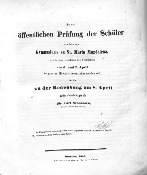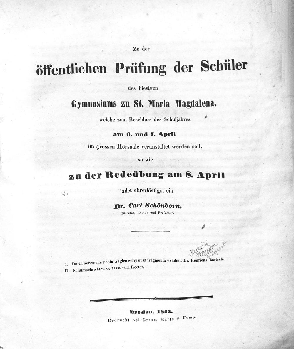 Zu der öffentlichen Prüfung der Schüler des hiesigen Gymnasiums zu St. Maria-Magdalena, welche ... in dem Prüfungssaale veranstaltet werden soll, ladet ehrerbietigst ein