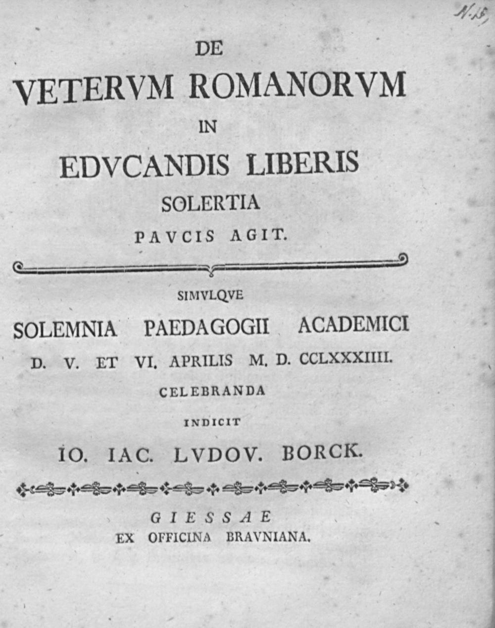 De veterum romanorum in educandis liberis solertia paucis agit / Johann Jakob Ludwig Borck