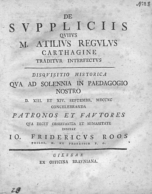 De suppliciis quibus M. Atilius Regulus Carthagine traditur interfectus / Johann Friedrich Roos