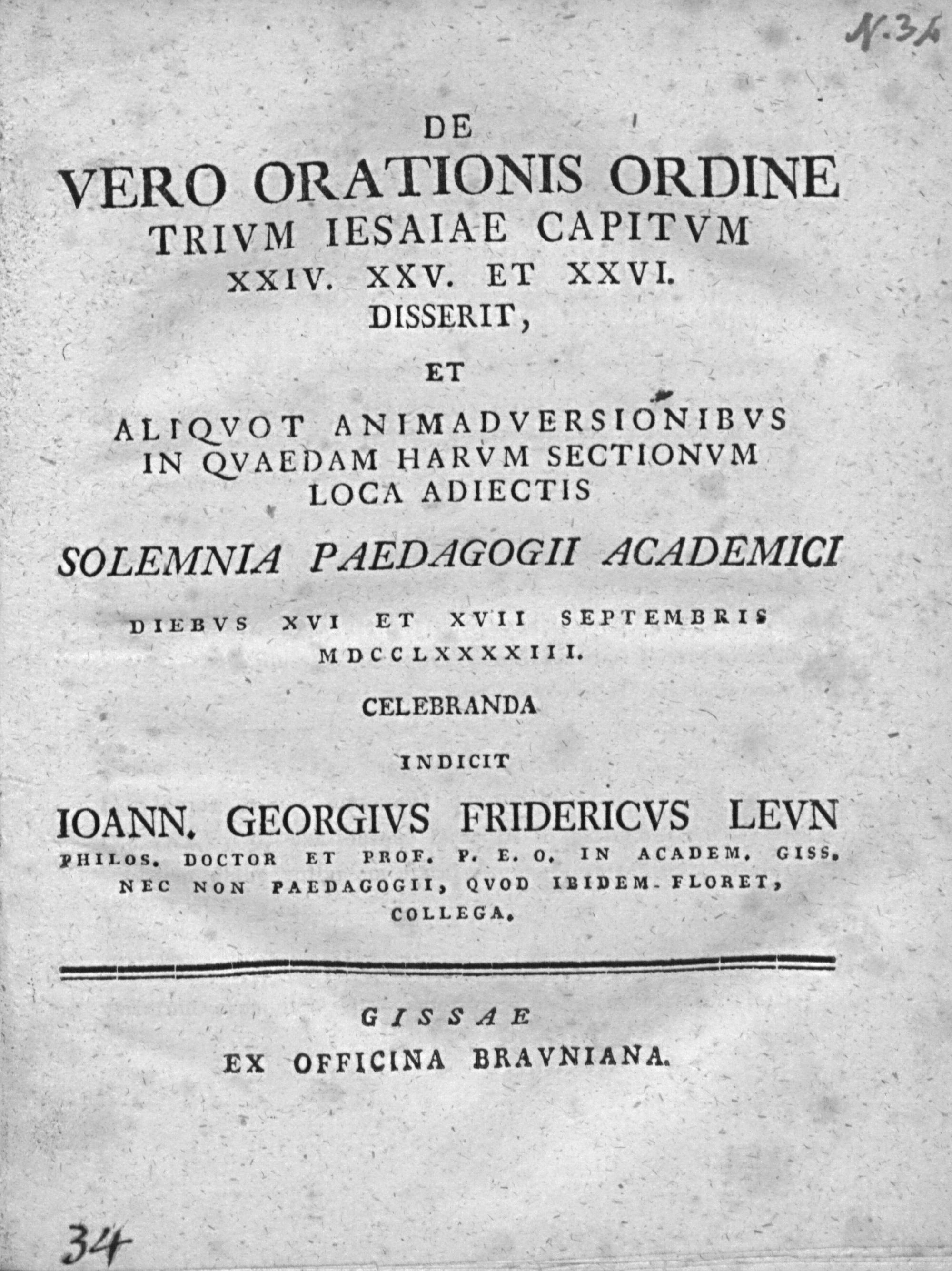 De vero orationis ordine trium Jesaiae capitum XXIV. XXV. et XXVI / Johann Georg Friedrich Leun