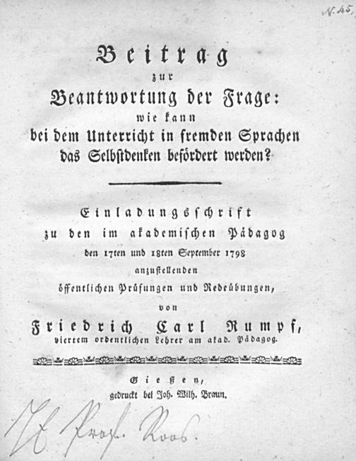 Beitrag zur Beantwortung der Frage: wie kann bei dem Unterricht in fremden Sprachen das Selbstdenken befördert werden? / Friedrich Karl Rumpf