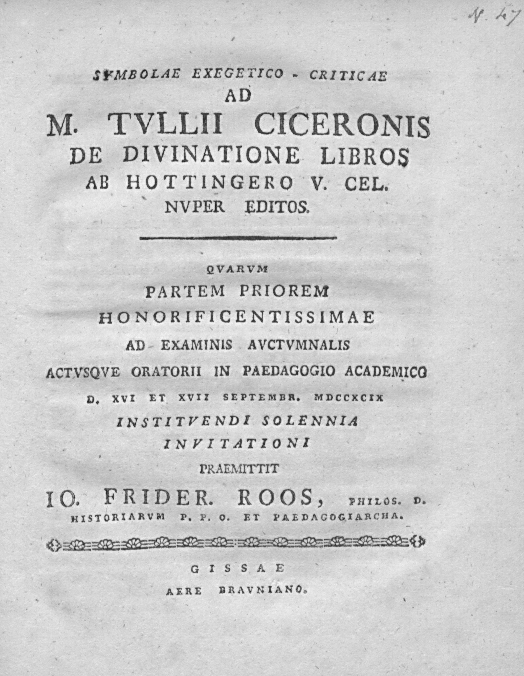 Symbolae exegetico-criticae ad M. Tullii Ciceronis de divinatione libros ab Hottingero V. cel. nuper editos / Johann Friedrich Roos