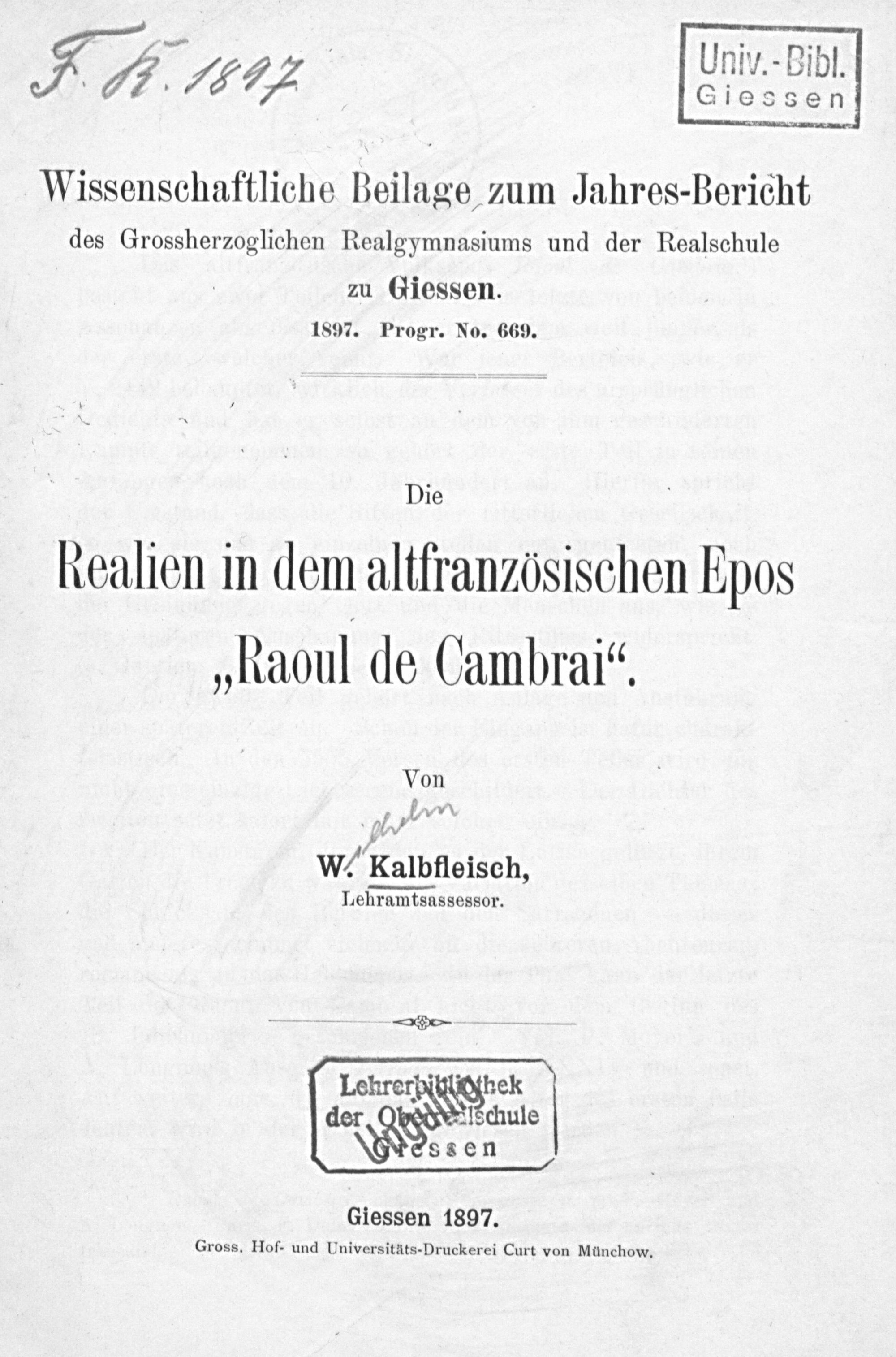 Die Realien in dem altfranzösischen Epos "Raoul de Cambrai" / W. Kalbfleisch