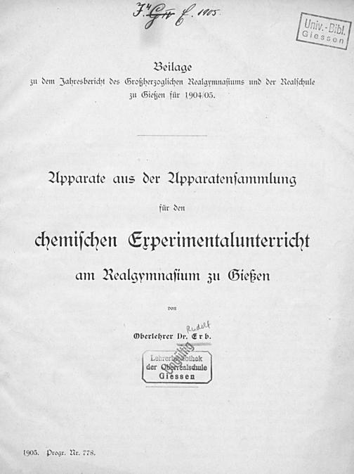 Apparate aus der Apparatensammlung für den chemischen Experimentalunterricht am Realgymnasium zu Giessen / von Erb