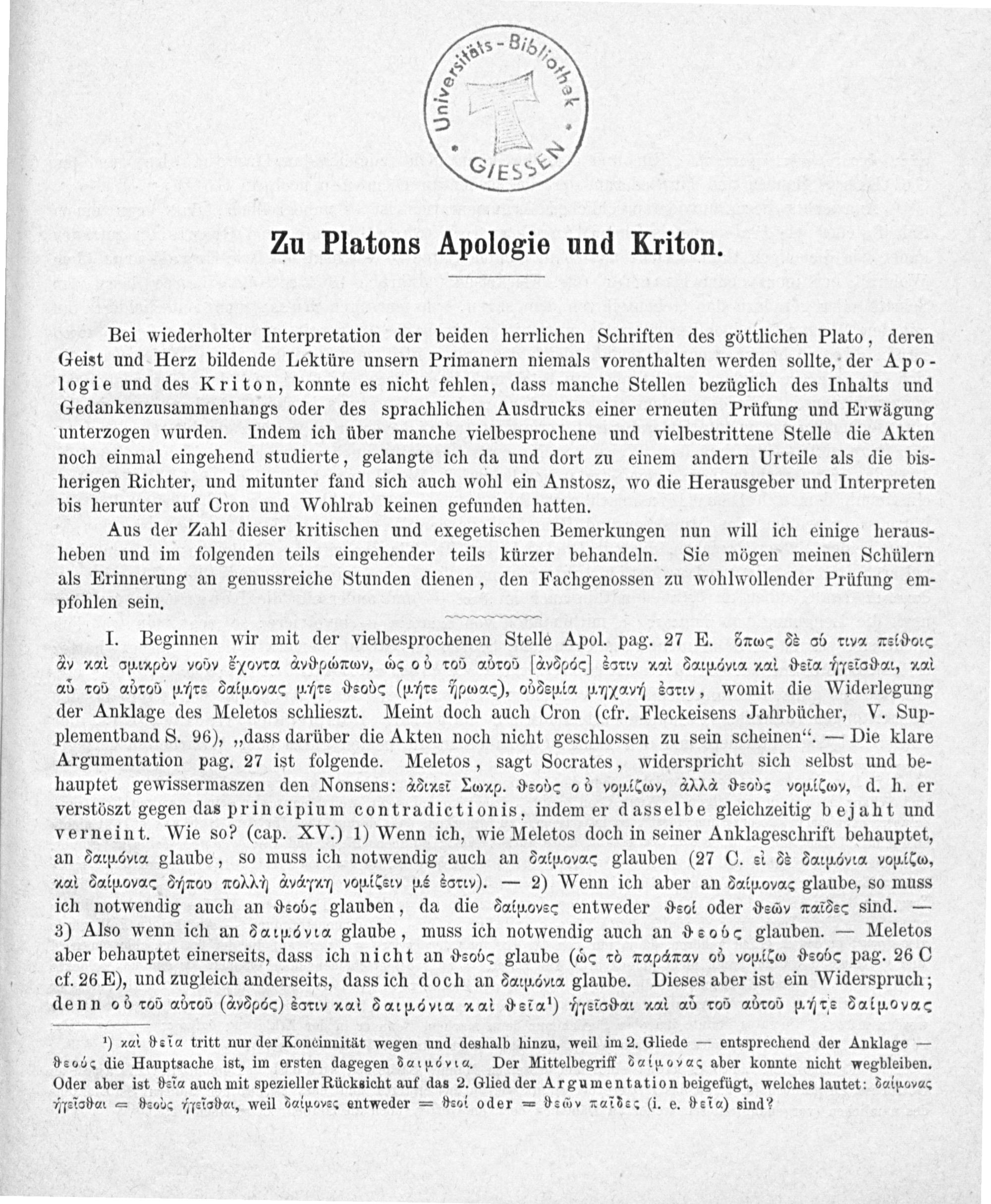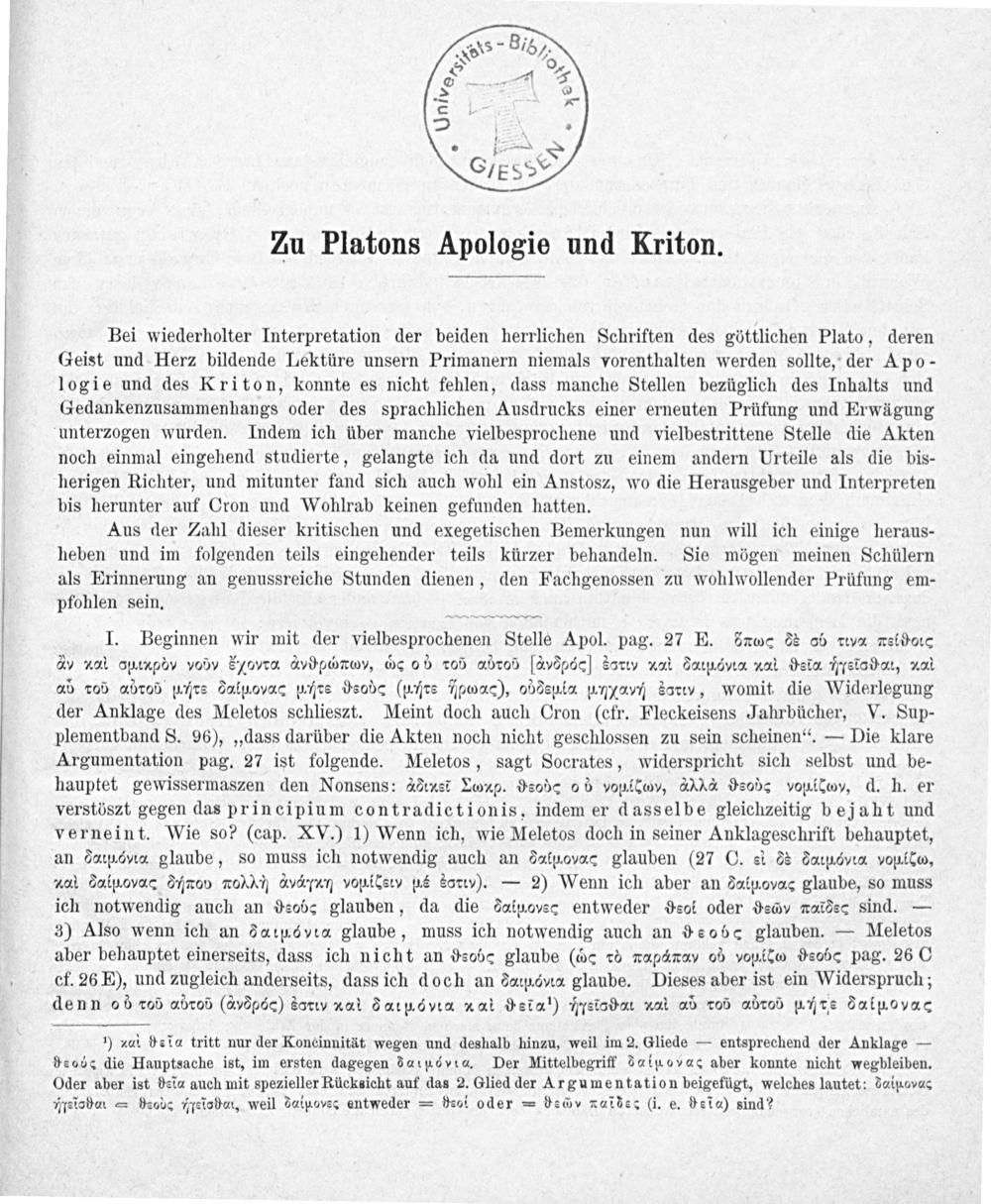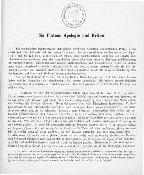 Zu Platons Apologie und Kriton / Eduard Goebel