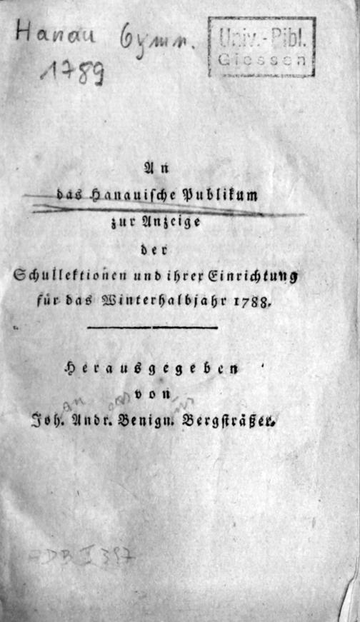 An das Hanauische Publikum zur Anzeige der Schullektionen und ihrer Einrichtung für das ...