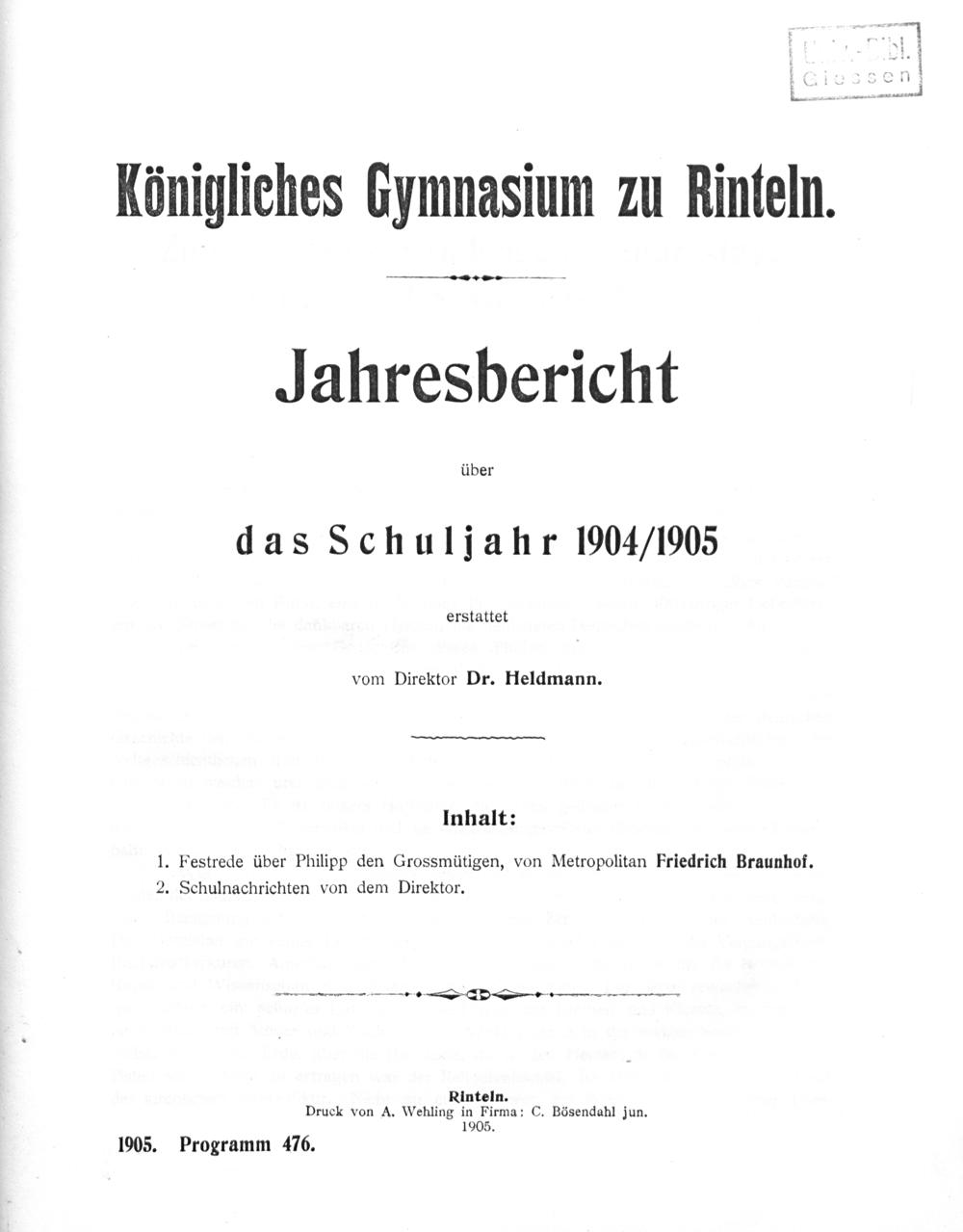 Zum vierhundertjährigen Geburtstage Philipps des Großmütigen : Rede, gehalten am Königlichen Gymnasium zu Rinteln am 12. November 1904 / von ... Braunhof