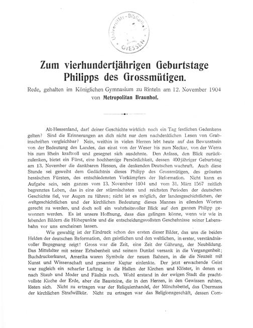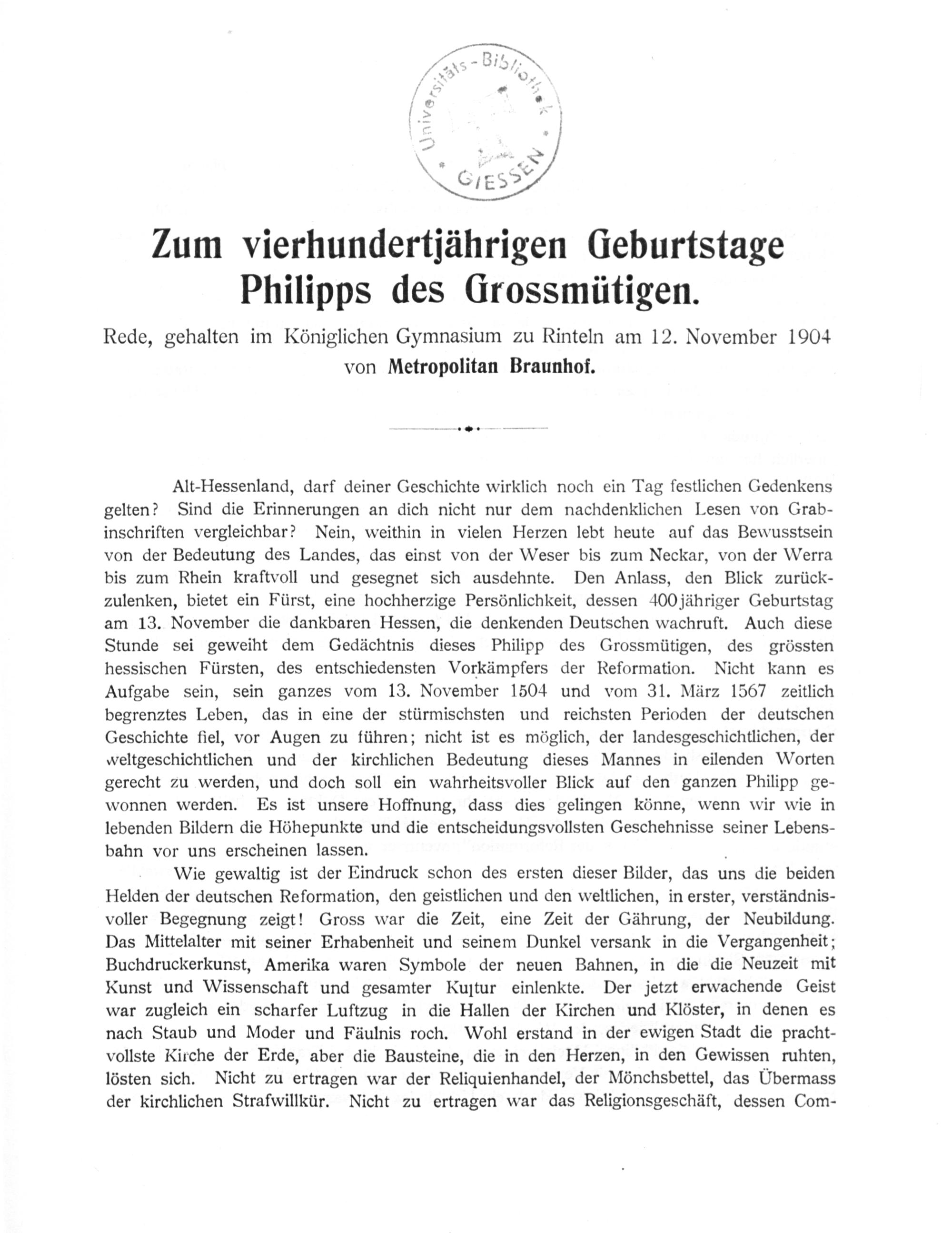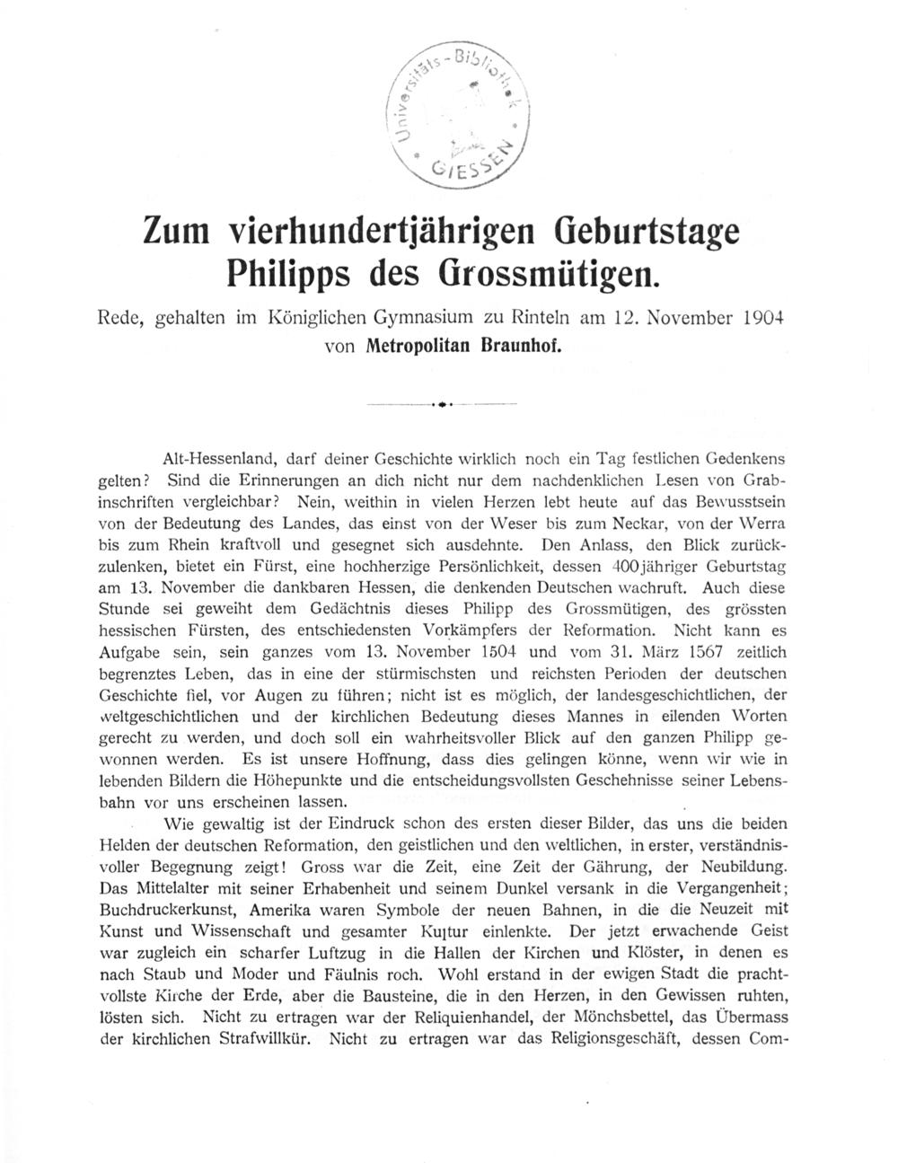 Zum vierhundertjährigen Geburtstage Philipps des Großmütigen : Rede, gehalten am Königlichen Gymnasium zu Rinteln am 12. November 1904 / von ... Braunhof