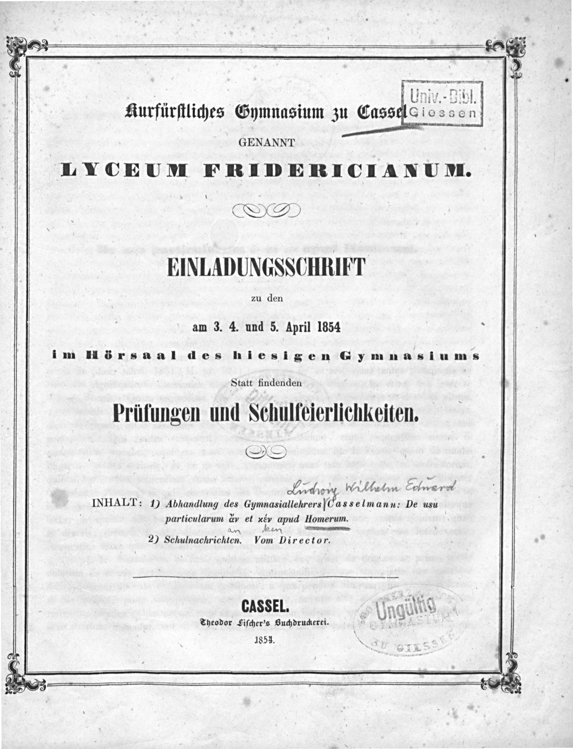 Einladungsschrift zu den am ... im Hörsaal des Gymnasiums statt findenden Prüfungen und Schulfeierlichkeiten