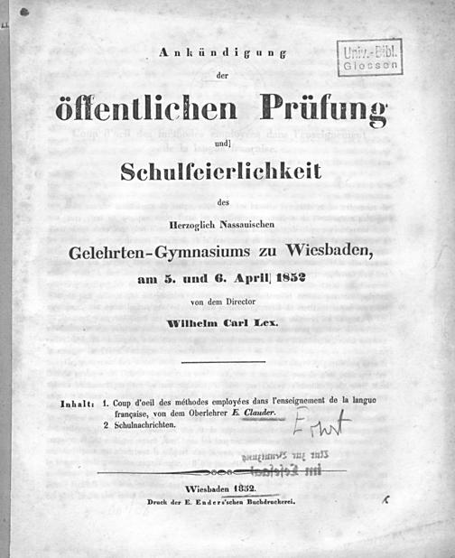 Ankündigung der öffentlichen Prüfung des Herzoglich-Nassauischen Gelehrten-Gymnasiums zu Wiesbaden