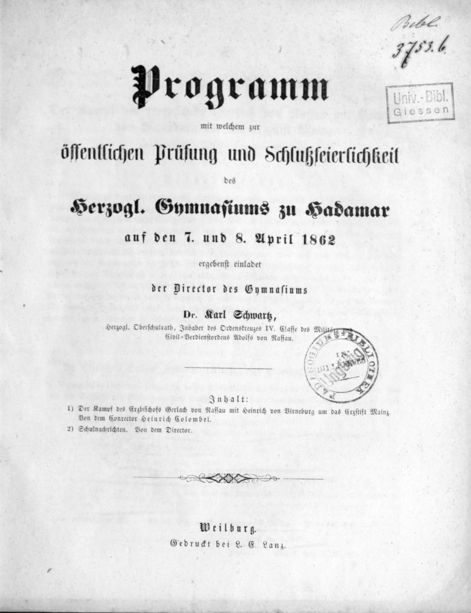 Programm, mit welchem zu der öffentlichen Prüfung & Schlußfeierlichkeit des Herzoglich Nassauischen Gymnasiums zu Hadamar auf den ... ergebenst einladet