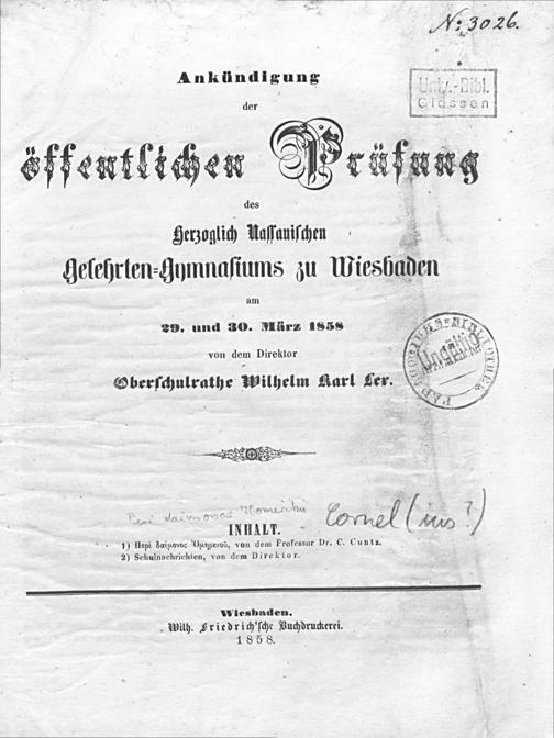Ankündigung der öffentlichen Prüfung des Herzoglich-Nassauischen Gelehrten-Gymnasiums zu Wiesbaden