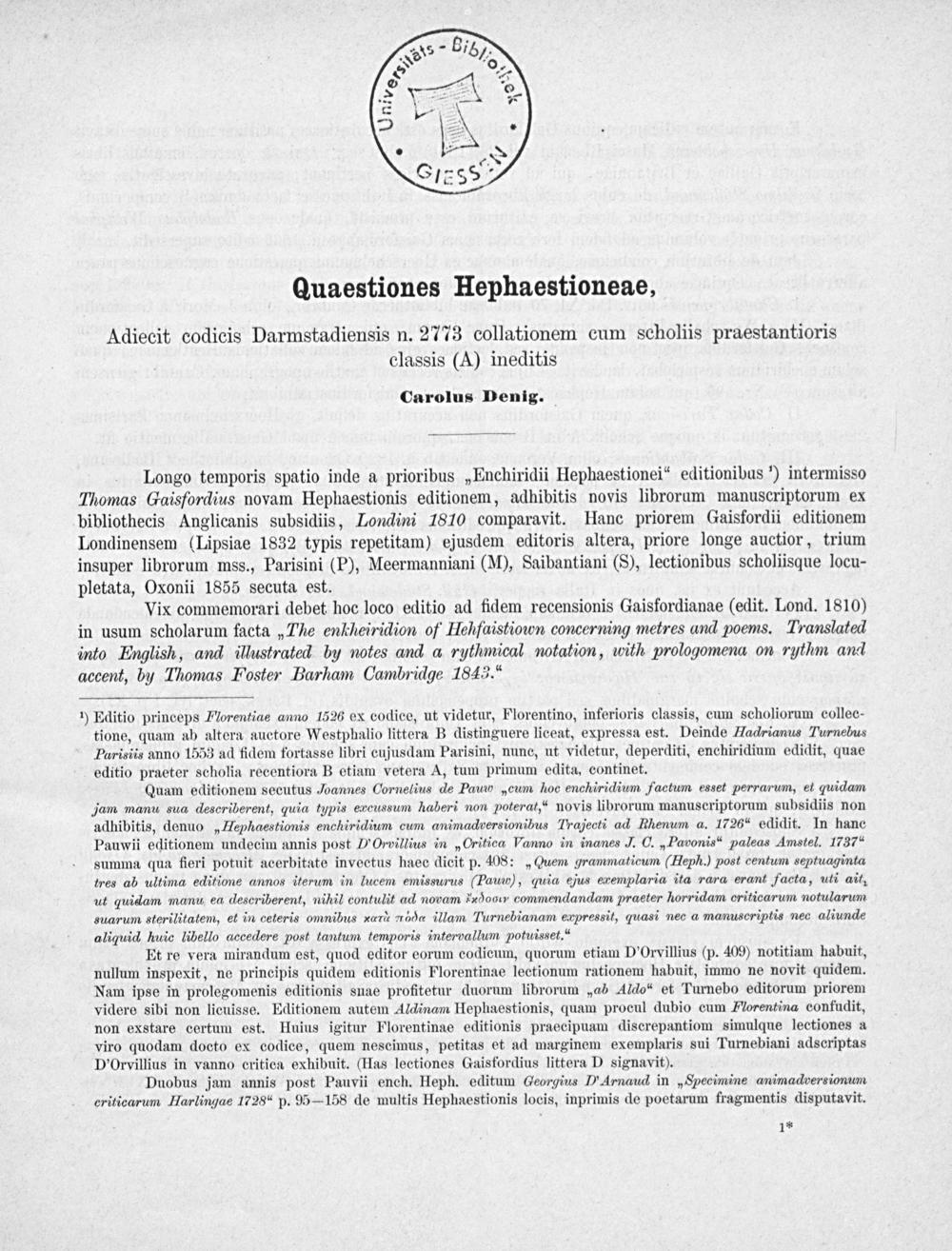 Quaestiones Hephaestioneae : adiecit codicis Darmstadiensis n. 2773 collationem cum scholiis praestantioris classis (A) ineditis / Carolus Denig