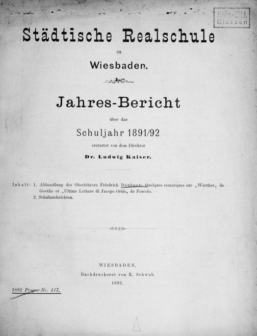 Quelques remarques sur "Werther" de Goethe et "Ultime Lettere di Jacopo Ortis" de Foscolo / Friedrich Deubner