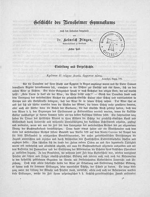 Geschichte des Bensheimer Gymnasiums nach den Urkunden dargestellt : 1. Teil / von Heinrich Dinges