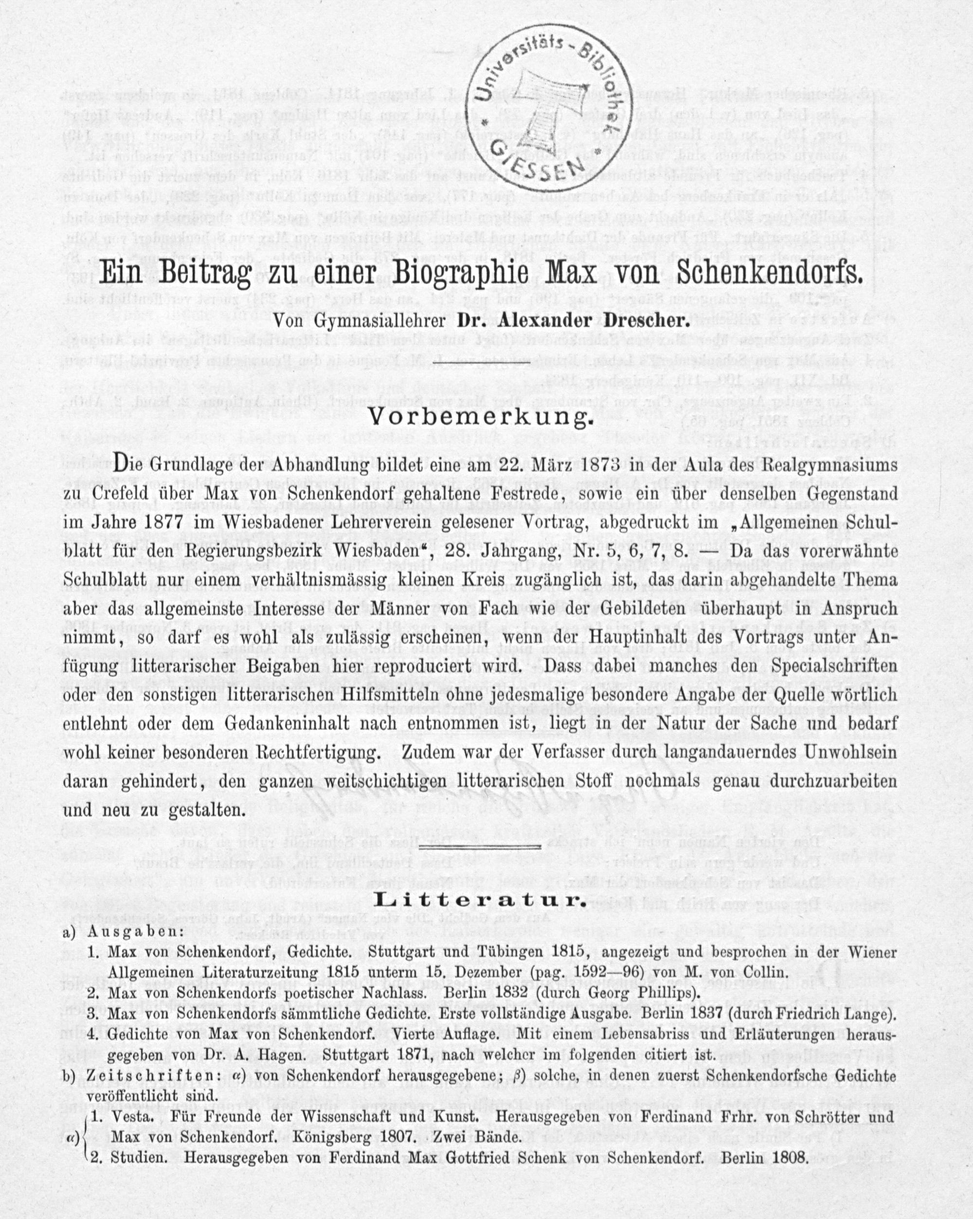 Ein Beitrag zu einer Biographie Max von Schenkendorfs / von Drescher