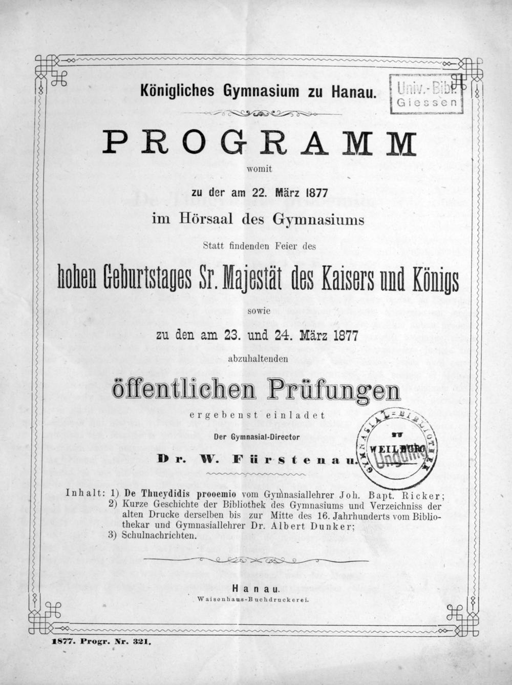 Kurze Übersicht über die Geschichte der Bibliothek des Königlichen Gymnasiums zu Hanau und Verzeichnis der alten Drucke derselben bis zur Mitte des 16. Jahrhunderts