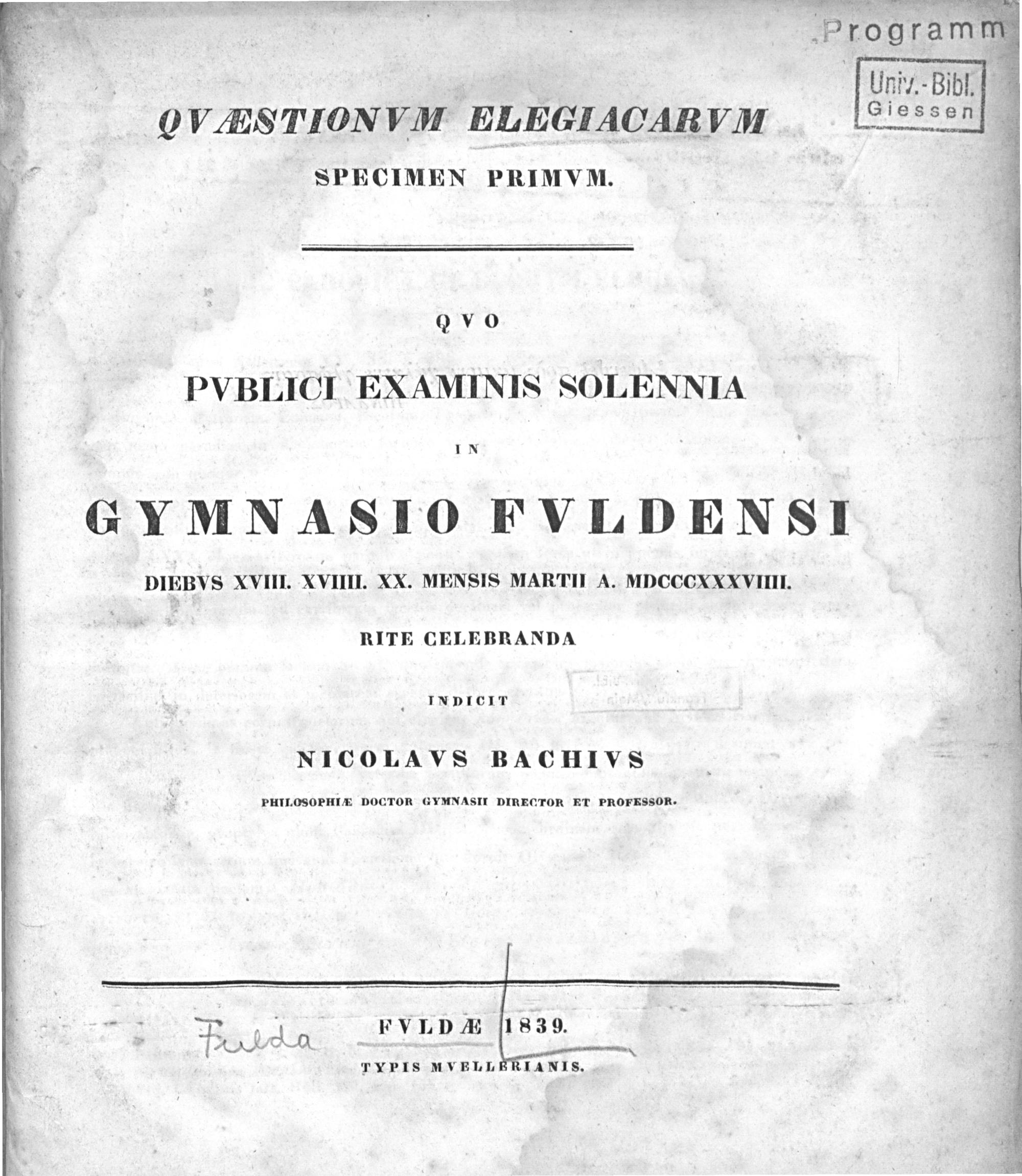 Quo publici examinis solennia in Gymnasio Fuldensi ... rite celebranda indicit