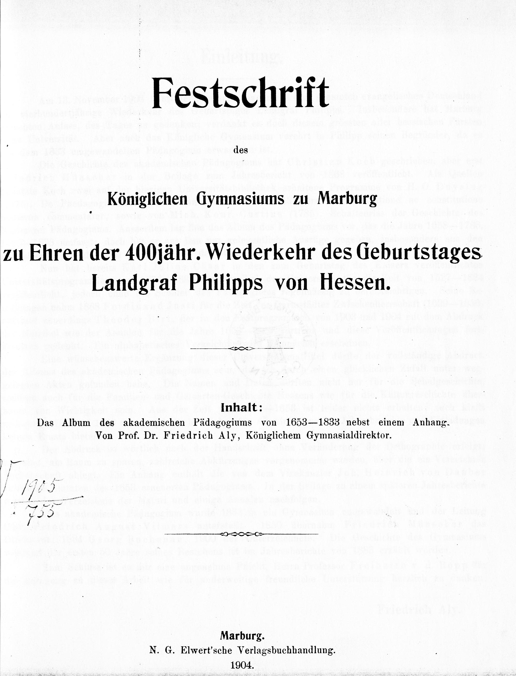 Aly, Friedrich: Das Album des akademischen Pädagogiums von 1653-1833. Nebst einem Anhang. Festschrift des Königl. Gymnasiums zu Marburg zu Ehren der 400jährigen Wiederkehr des Geburtstages Landgraf Philipps von Hessen